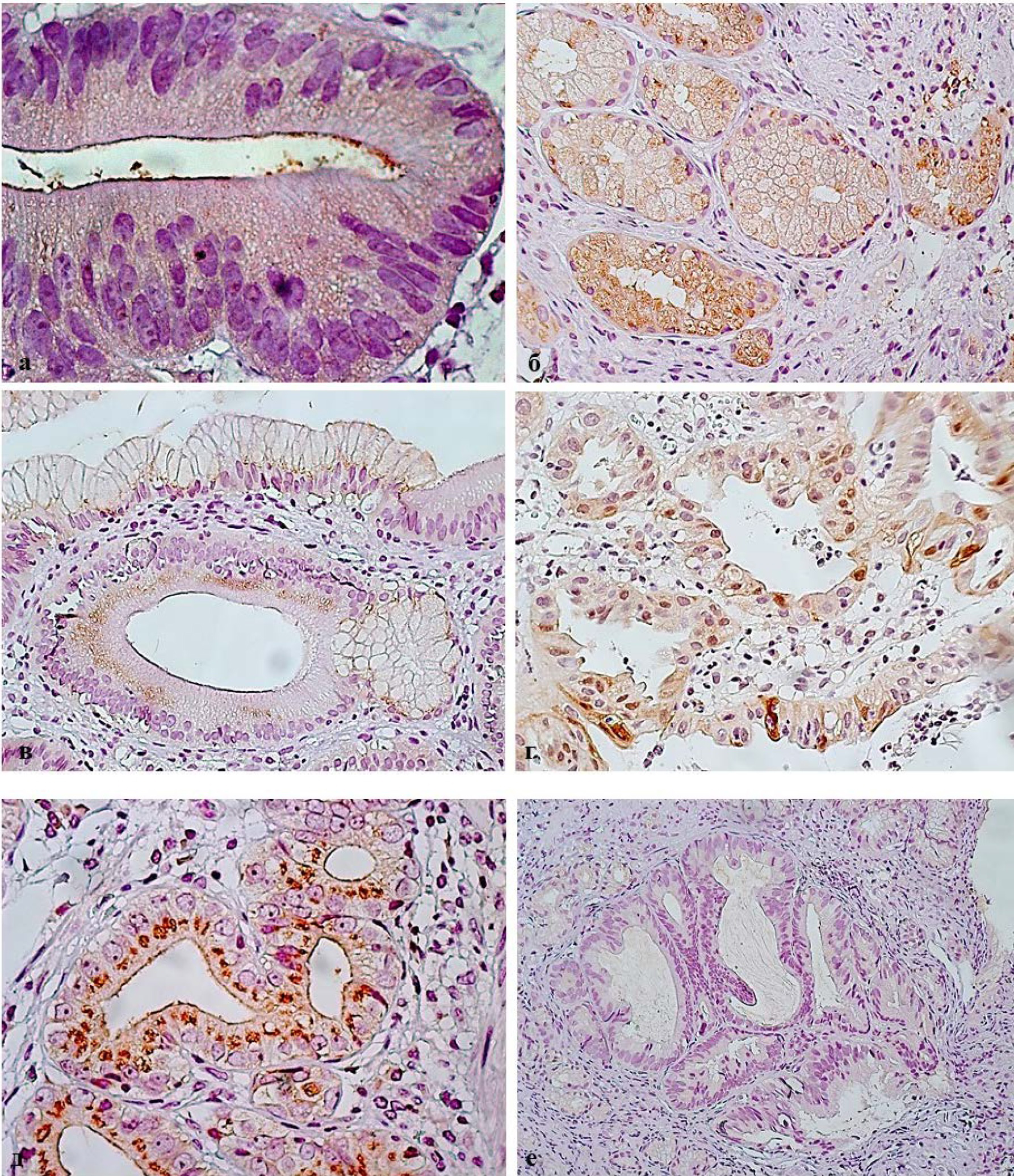 Рис. 2. ИГХ-паттерны экспрессии белка HER2 (а – интрамукозальная карцинома, х100, апикальная метка; б – дисплазия высокой степени, х40, цитоплазматическая метка; в – дисплазия низкой степени, х40, очаговое цитоплазматическое окрашивание в виде «полоски»; г – неопределенная дисплазия, х40, слабая очаговая ядерная метка; д - диспла-зия высокой степени, х63, очаговое цитоплазматическое окрашивание в виде «полоски» в сочетании с апикальной меткой; е - дисплазия высокой степени, х20, отсутствие окрашивания в очаге дисплазии)