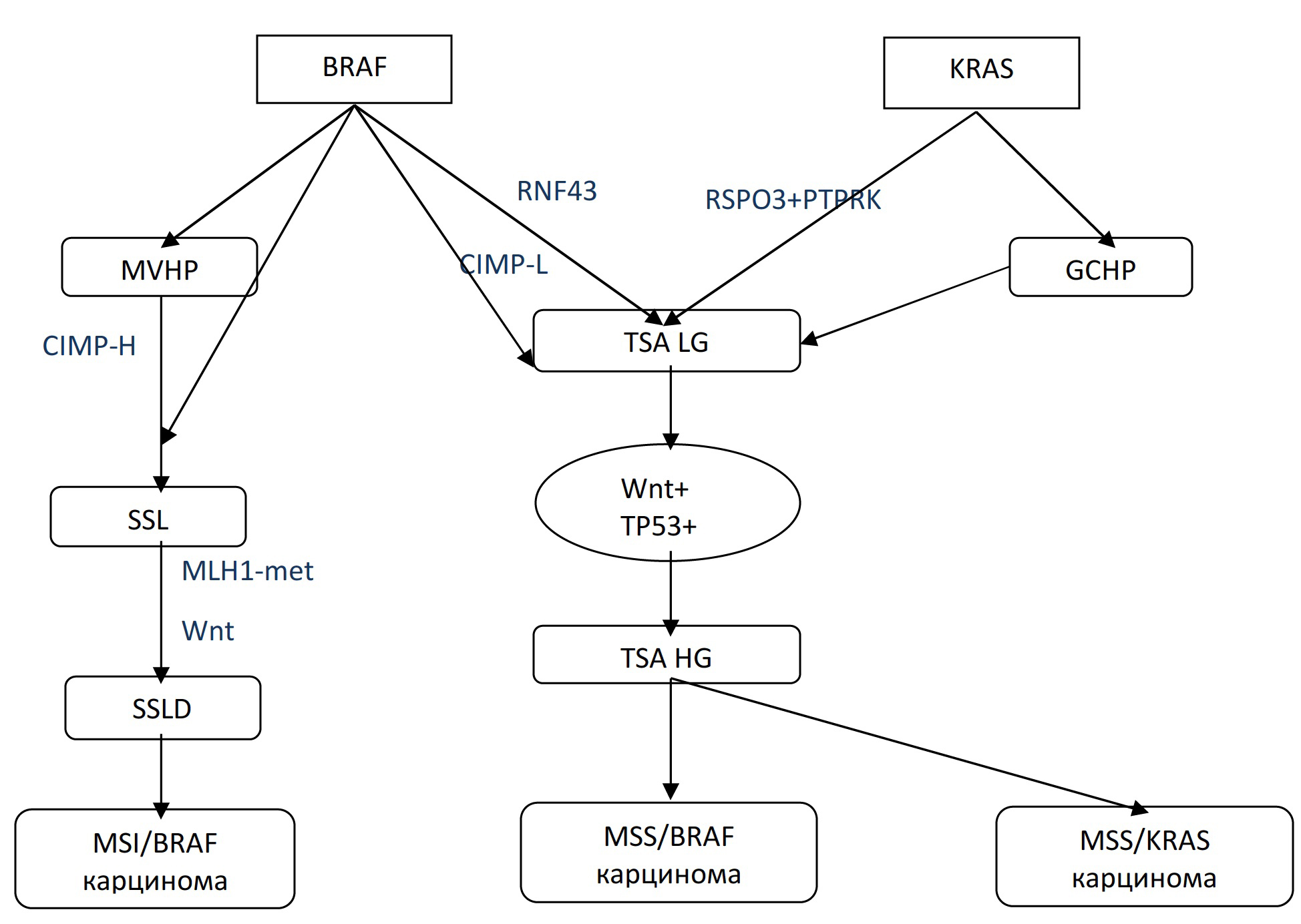 SSL (sessile serrated lesion – зубчатое образование на широком основании) имеет BRAF мутацию и может возникать de novo или через MVHP (microvesicular hyperplastic polyp – микровезикулярный гиперпластический полип). Ключевым молекулярным событием для эволюции в SSLD (sessile serrated lesion with dysplasia – зубчатое образование на широком основании с дисплазией) является метилирование MLH1 гена системы репарации ДНК и и возникновения CIMP-H (CpG island methylator phenotype positivity - молекулярный фенотип метилирования CpG-островков) с прогрессированием в MSI/BRAF (микросаттелитно нестабильную карциному, через активацию Wnt и мутацию в гене ТР53. TSA (traditional serrated adenoma – традиционная зубчатая аденома) эволюционирует через GCHP (goblet-cell rich hyperplastic polyp – гиперпластический полип, богатый бокаловидными клетками) в TSA LG (традиционная зубчатая аденома с дисплазией низкой степени) или непосредственно после мутации в генах BRAF и KRAS с дополнительными альтерациями в гене RNF43 (Receptor-type tyrosine-protein phosphatase kappa) и слияниями в RSPO3 (R-Spondin 3) с PTPRK с дальнейшей активацией Wnt и прогрессированием в MSS (микросаттелитно стабильную) карциному