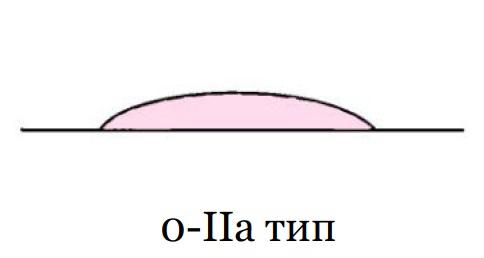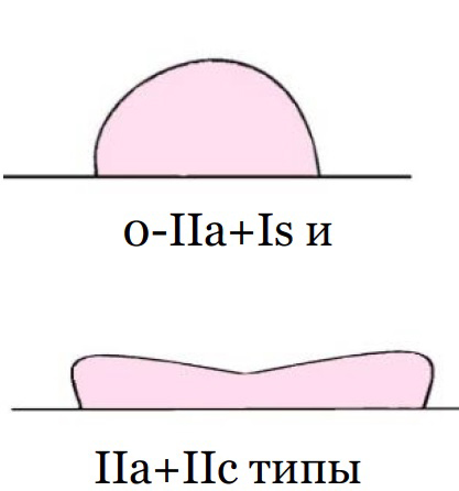 Парижская классификация новообразований ЖКТ: 0-IIa тип – неполиповидный, плоский либо слегка приподнятый; 0-IIa+Is – приподнятый, на широком основании; IIa+IIc – слегка приподнятый, слегка углубленный; Ip – полиповидный. Классификация рельефа поверхности Kudo-Fujii: II тип – регулярно расположенные ямки больших размеров и звездчатой формы; III тип – компактно расположенные маленькие округлые и большие вытянутые ямки; IV тип – ямки по типу ветвей или извилин.