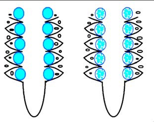 К характерным морфологическим чертам гиперпластических полипов относится удлинение кишечных крипт с формированием в верхних двух третях крипт зубчатого контура, а также наличие равномерной и симметричной зоной пролиферации, располагающейся в основаниях крипт. В MVHP эпителий представлен клетками с обильной цитоплазмой, содержащей мелкие апикальные вакуоли, и небольшим количеством бокаловидных клеток. В GCHP крипты также удлинены и расширены, в их эпителиальной выстилке преобладают бокаловидные клетки с небольшими одинаковыми базально ориентированными ядрами.