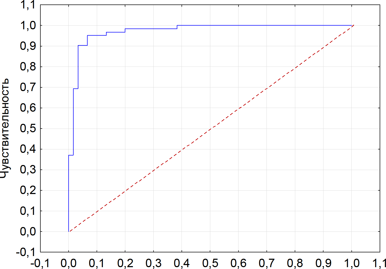 По результатам проведенного ROC-анализа, оптимальный порог отсечения составил 0,51 (вероятность положительного исхода модели, соответствующая максимальной суммарной чувствительности и специфичности модели), этой величине соответствовала чувствительность 93%, специфичность – 90%. площадь под кривой AUC - 0,97 (рисунок 2).