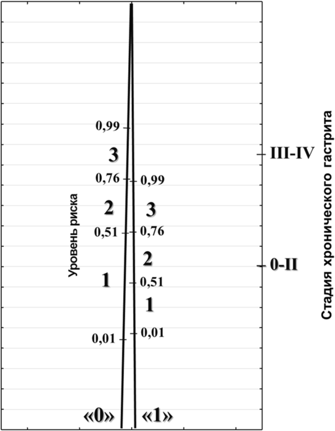 Рисунок 3 – Номограмма предикции аденокарциномы желудка при хроническом гастрите. Ось уровня риска «1» используется при наличии индекса преобладания гастрита тела, «0» – при его отсутствии; зоны уровня риска на оси, разделенные пограничными значениями уровня риска (в долях от единицы): 1 – низкий риск, 2 – высокий риск, 3 – очень высокий риск