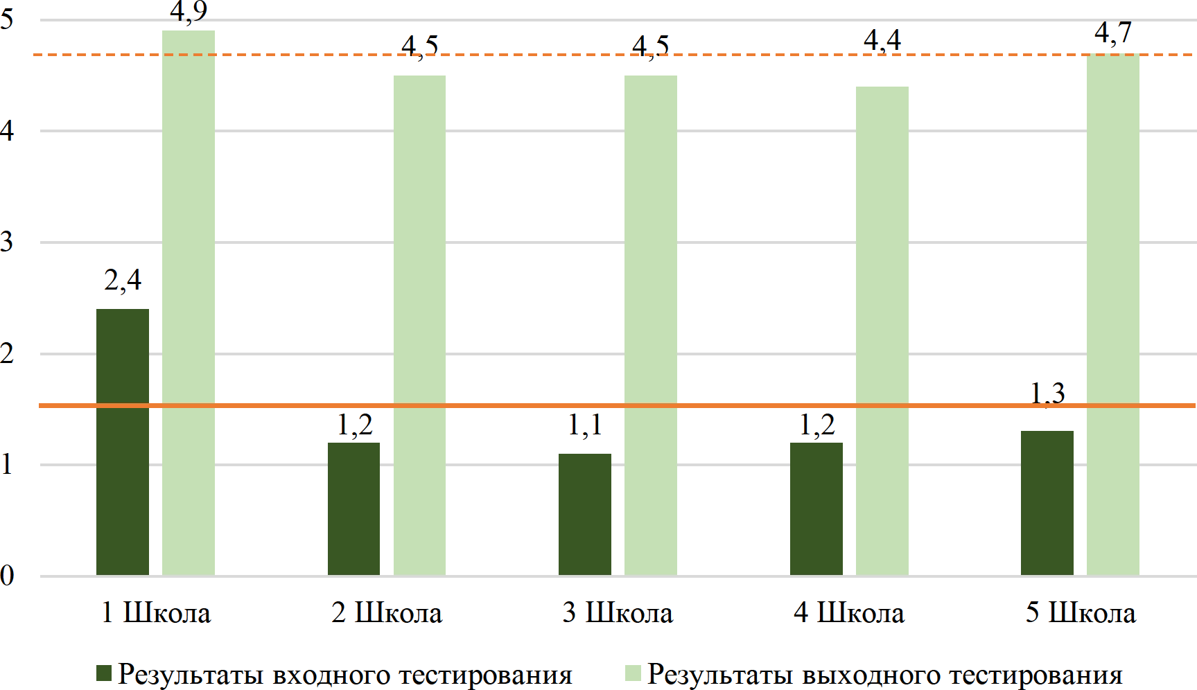 Внутригрупповой анализ среди обучающихся каждой из школ также продемонстрировал наличие статистически значимых различий между результатами входного и выходного тестирования (p < 0,05, р, Wilcoxon Matched Pairs Test). Результаты входного и выходного тестирований по школам представлены на рисунке 1. Абсолютно все участники исследования написали выходное тестирование лучше, чем входное. Среди 647 старшеклассников абсолютно никто не написал на 100% входное тестирование, при этом 471 обучающийся написали выходное тестирование на 100% (5 баллов из 5 возможных).