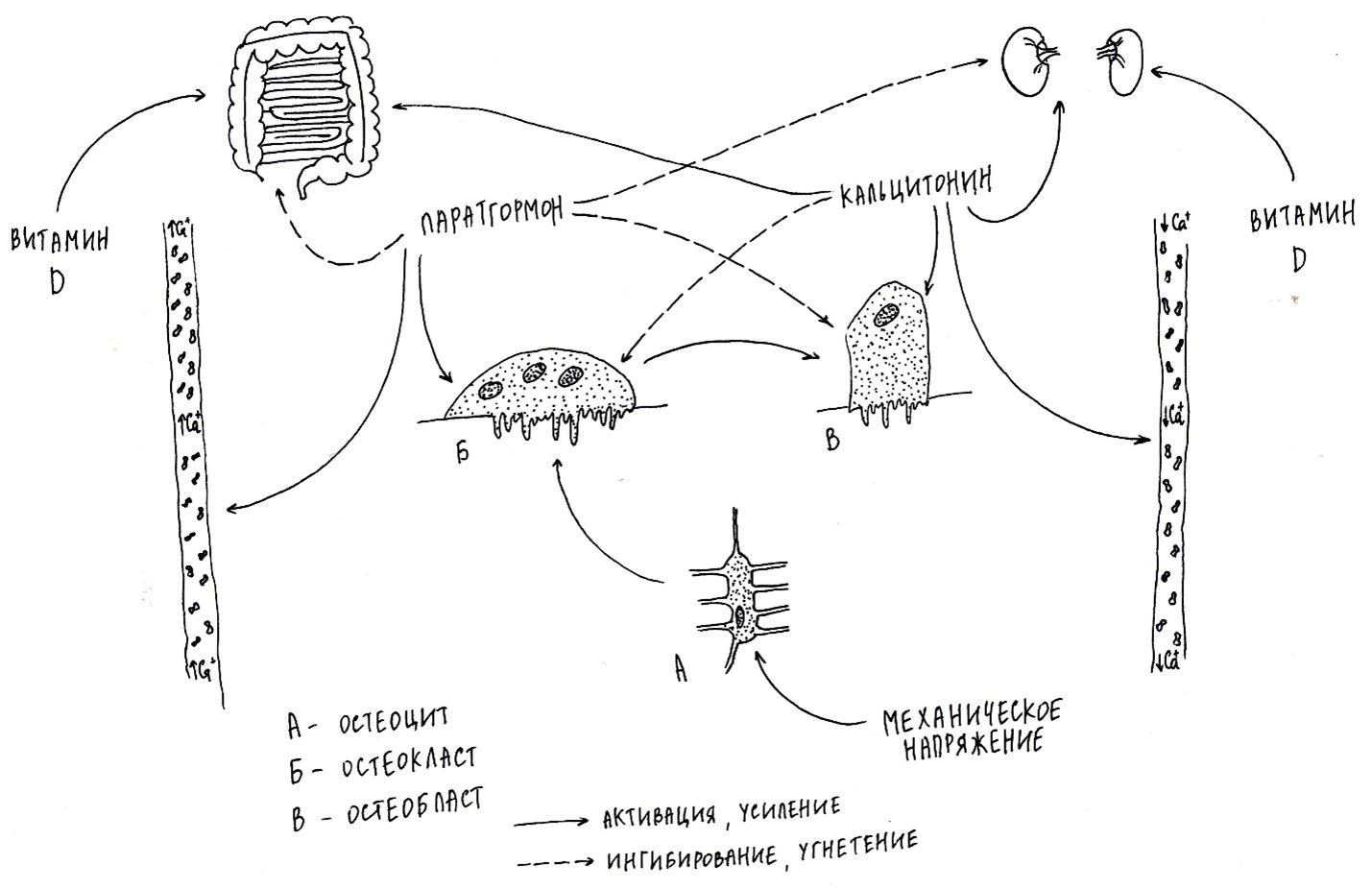 Гормональное влияние обусловлено паратгормоном, вырабатываемом паращитовидными железами, который регулирует уровень кальция, воздействуя на процесс резорбции костной ткани. За счёт обратной связи этот гормон контролируется уровнем кальция в сыворотке. Другой гормон – кальцитонин – сохраняет целостность костной ткани, контролируя уровень кальция и фосфата, подавляет резорбцию кости за счёт ингибирования остеокластов (рис. 1) [60].