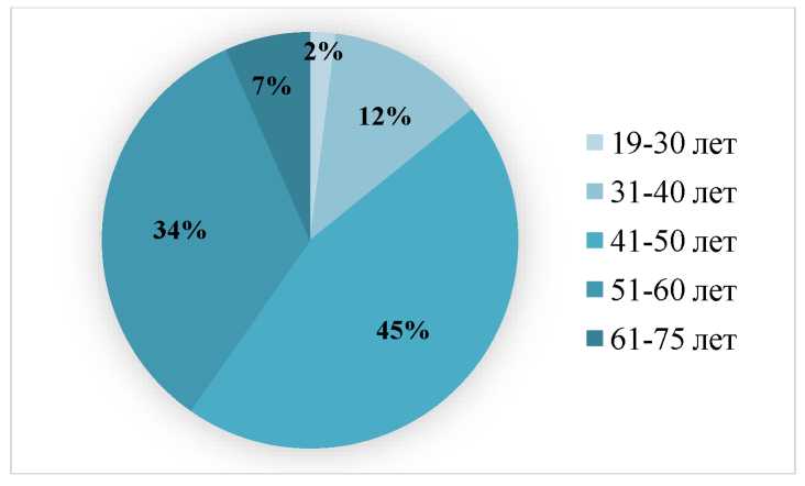 Средний возраст пациенток при установлении связи заболевания с профессией составил 49 лет (Ме=49, диапазон Q1–Q3=44–53). При оценке возрастной структуры выявлено, что наибольший удельный вес (45 %) имеет возрастная группа 41–50 лет, меньше всего впервые установленных заболеваний зарегистрировано среди женщин в возрасте 19–30 лет (рис. 2).