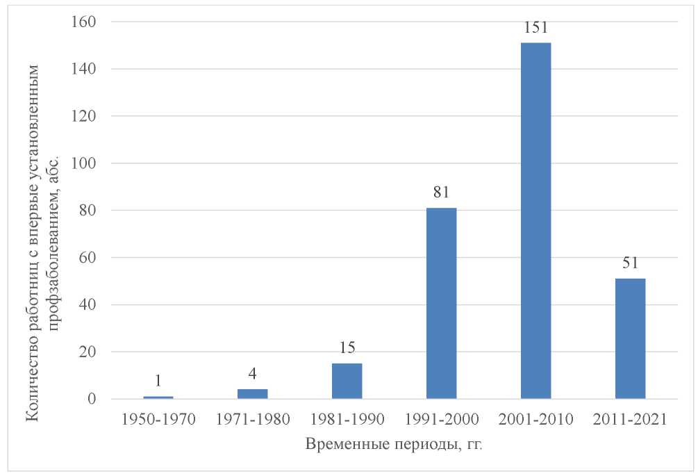 В период 2001–2010 гг. зарегистрировано максимальное количество женщин с профессиональными заболеваниями – 151 случай (49,8 %). На графике (см. рис. 3) прослеживается увеличение количества установленных диагнозов с 1957 г. по 2010 г. с 1 до 151, затем происходит снижение выявляемости в период 2011–2021 гг., что является статистически значимым (T>2, p<0,05).