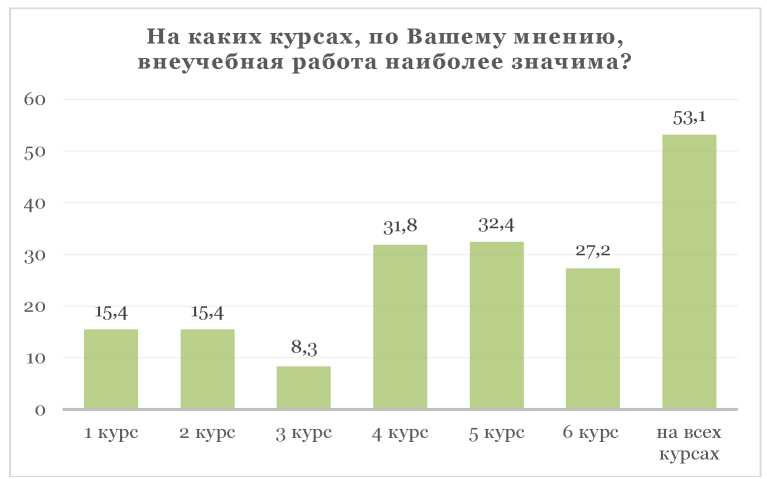 Большинство респондентов (53,1%) считают, что внеучебная работа важна и значима на протяжении всего периода обучения, вопреки высказываемому порой мнению о важности ее осуществления только на младших курсах для вхождения студентов в новые жизненные обстоятельства. Только 15,4 % отмечают эффективность внеучебной работы на 1-м и 2-м курсах. Такой низкий процент может быть связан с серьезными проблемами адаптации к условиям специфической организации образовательного процесса в медицинском вузе, трудностями перестройки учебного графика у недавних школьников и неумением правильно организовать свое свободное время (рисунок 1).