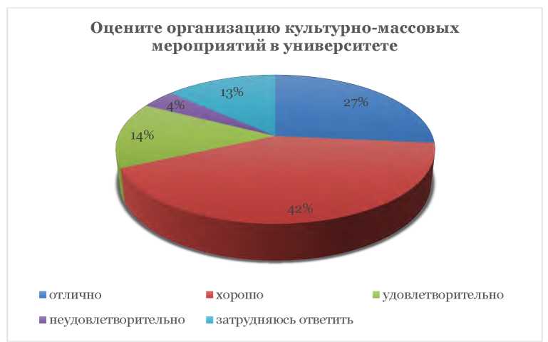 Необходимо отметить, что уровень организации культурно-массовых мероприятий в университете, большинством опрошенных (68,2%) оценивается на «хорошо» и «отлично». Однако часть респондентов (4,1%) считает ее неудовлетворительной (рисунок 2).