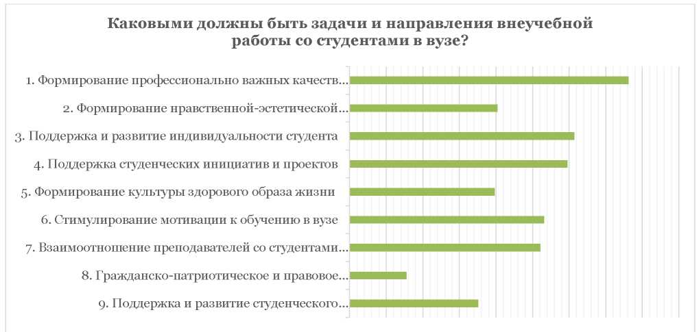 Оценивая перспективы развития внеучебной работы, большинство респондентов (76,3%) отметили, что основными задачами ее реализации видят формирование профессионально важных качеств личности, 61,4% указали на поддержку и развитие индивидуальности студента. Необходимо отметить, что данные ответы соответствуют задачам, которые ставит перед собой Управление по МП и СР университета (рисунок 3).