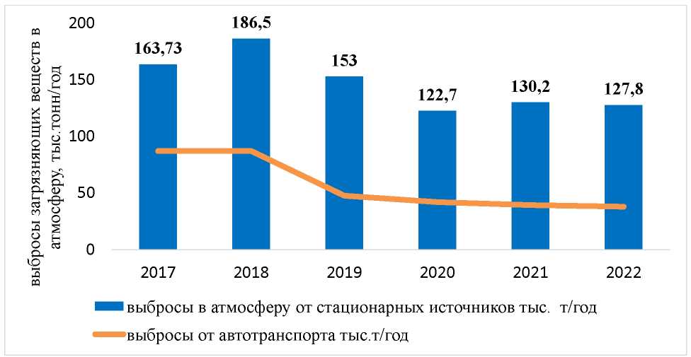 Объемы неуловленных выбросов ЗВ в атмосферу от стационарных источников (промышленность) снизились на 21,9% по сравнению с базовым 2017 годом, от автотранспорта - на 43,6% (рис.1). Уменьшение выбросов началось в 2019 году и продолжилось в последующие годы, когда промышленные предприятия приступили к мерам по сокращению выбросов ЗВ в соответствии с определенными для них квотами.