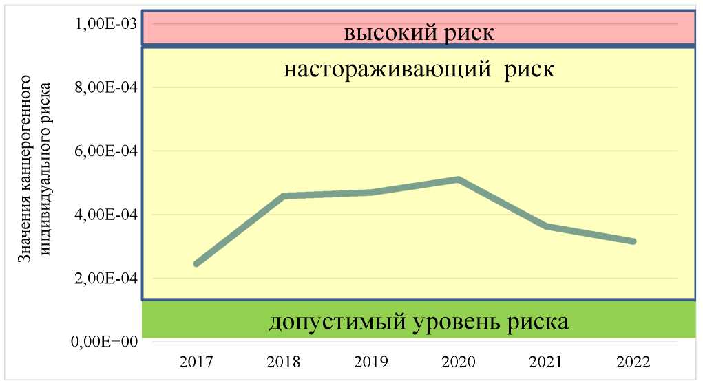 На протяжении всего периода наблюдения – уровень канцерогенного риска находился выше допустимого значения и оценивался как настораживающий, при этом, с 2017 года наблюдался рост показателя на 28,7% к 2022 году (рис.2). Максимальный подъем был в 2021 году, затем уровень канцерогенного риска начал снижаться, но не достиг значения 2017 года.