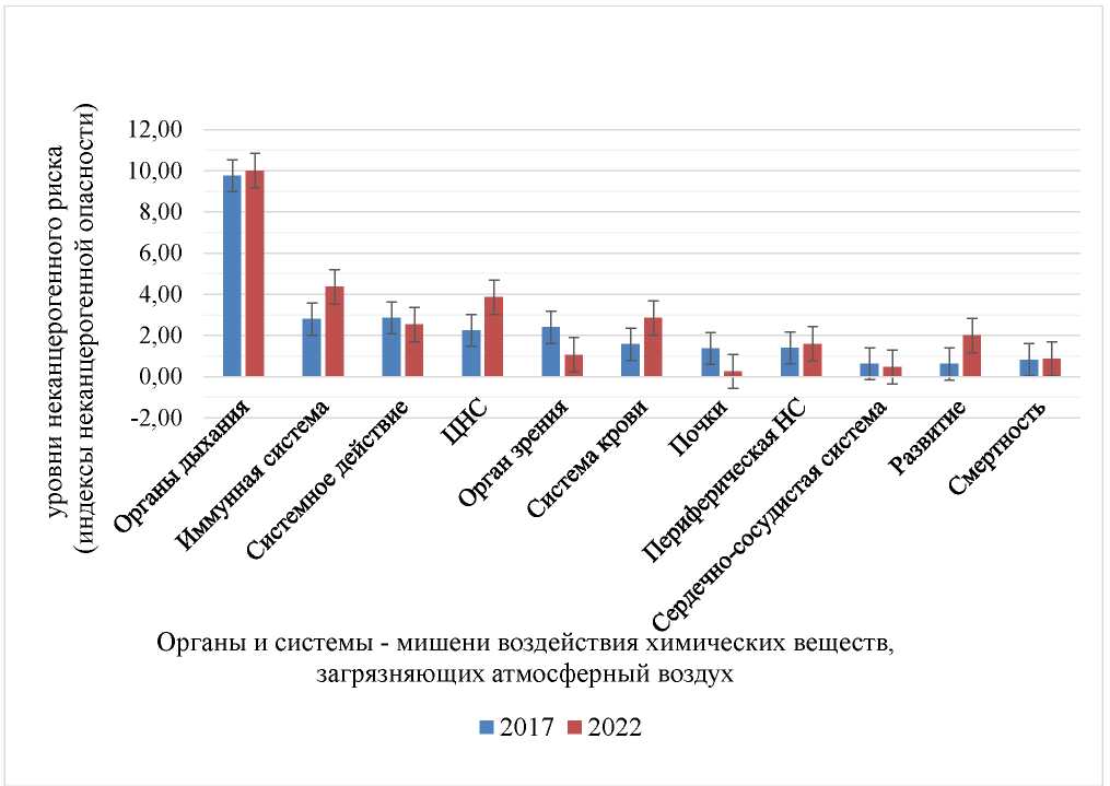 Рисунок 3. Сравнительная характеристика уровней неканцерогенных рисков в 2017 и в 2022 годах для населения г. Омска при воздействии химического загрязнения атмосферного воздуха; в разрезе органов и систем - мишеней воздействия загрязняющих веществ