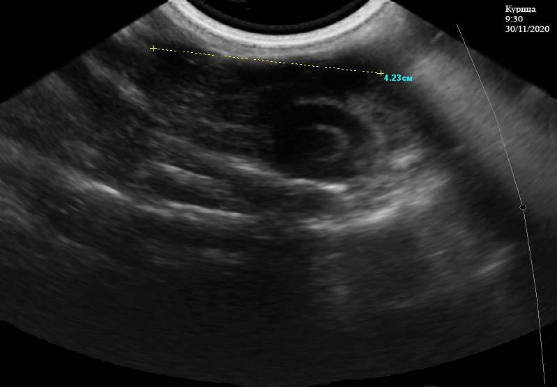 Четвертый этап исследования проводили в 9:01 часов 01.12.2020 г. Яйцо, находилось в матке в течение 20 часов, за это время произошла минерализация и покрытие его скорлупой. В матке яйцевода на эхограмме визуализируются анэхогенное образование – яйцо размером 4,70*2,60 см. В центре него выявляется гипоэхогенная структура с нечеткими контурами – желток. Контуры яйца ровные, границы нечеткие. Яйцо полностью заполняет полость матки, просвет между яйцом и стенкой матки отсутствует, контуры стенок матки четкие и ровные с однородной эхогенной структурой, узловых образований не обнаружено, сосуды матки не расширены. По его периферии видна тонкая гипоэхогенная линия – скорлупа. Дистально визуализируется слабый артефакт (рис. 5).