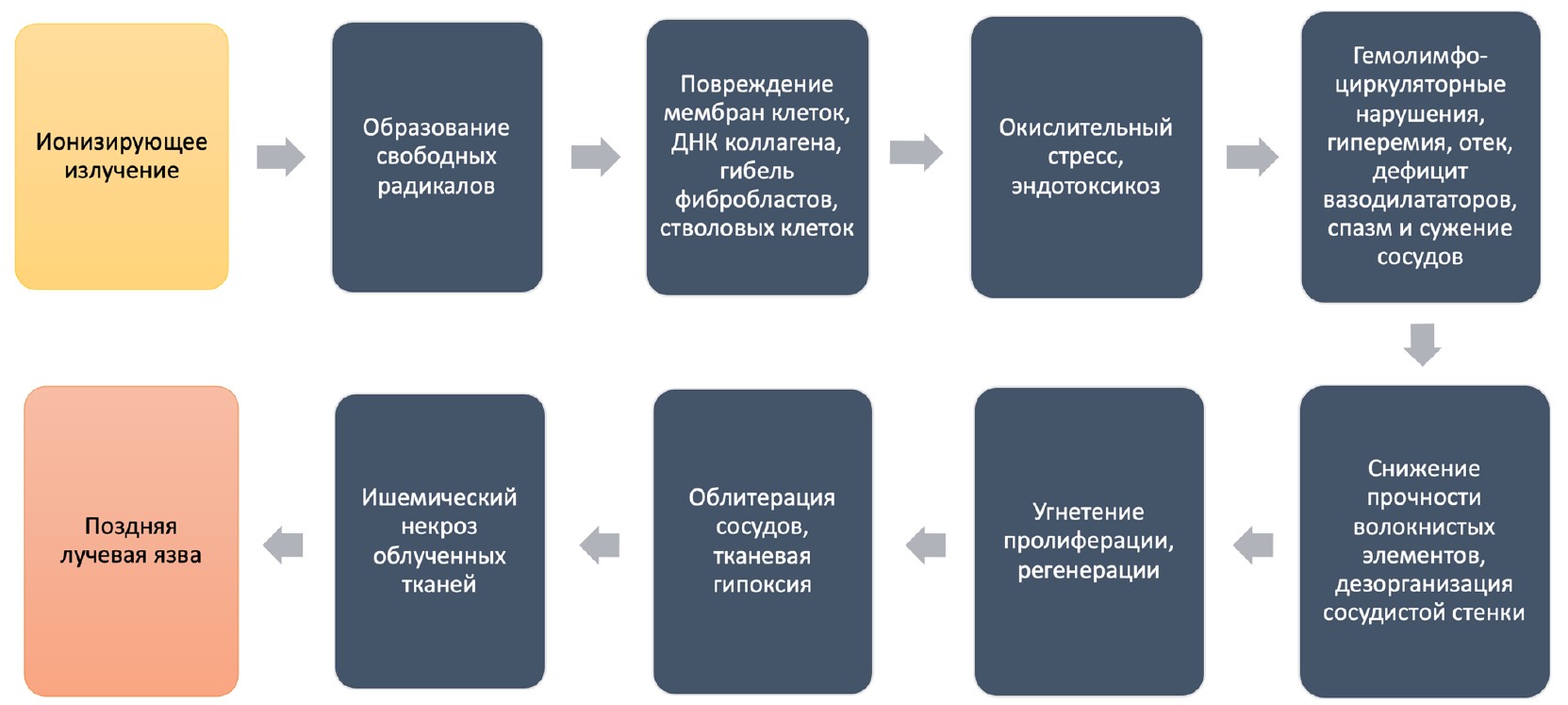 Важная роль в патогенезе лучевых язв кожи отводится нарушению тканевой микроциркуляции c последующим развитием ишемического некроза, как исхода лучевого эпителиита сосудов микроциркуляторного русла. По причине нарушения репарационных процессов и хронического воспаления, заживление язвенной поверхности происходит долгое время.  В дальнейшем может присоединиться инфекция, приводящая к усугублению негативных процессов заживления. Также, особенностями лучевой язвы кожи являются длительная экссудация и медленное отторжение некротизированной ткани вследствие недостаточной иммунной реактивности. Далее в процессе заживления лучевой язвы кожи развивается грануляционная ткань, и происходит длительная эпителизация поражения, которая может продолжаться годами (Пасов В.В., 2010). Учитывая вышеперечисленные факты, купирование окислительного стресса тканей стоит рассматривать как приоритетную задачу патогенетической терапии, решение которой возможно применением антиоксидантов.