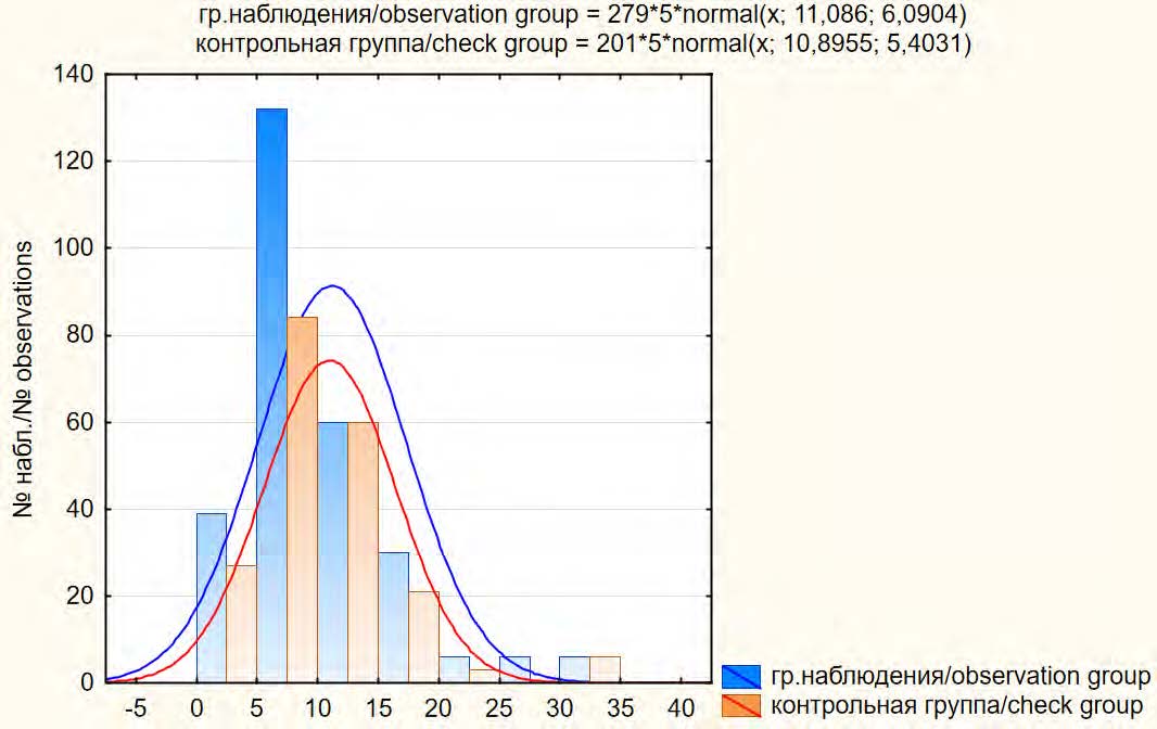 Рис. 2. Группировка вариант по продолжительности одного случая пропуска детей в дошкольных организациях по группе наблюдения и контрольной группе