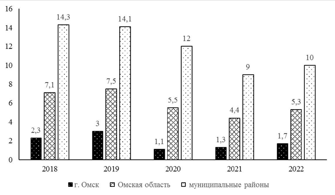 Среднемноголетний темп снижения составляет 11,2%, что свидетельствует о выраженной тенденции к сокращению заболеваемости. Данный тренд наблюдается как по районам области (темп убыли 10,2%), так и по г. Омску (темп убыли 15,5%).