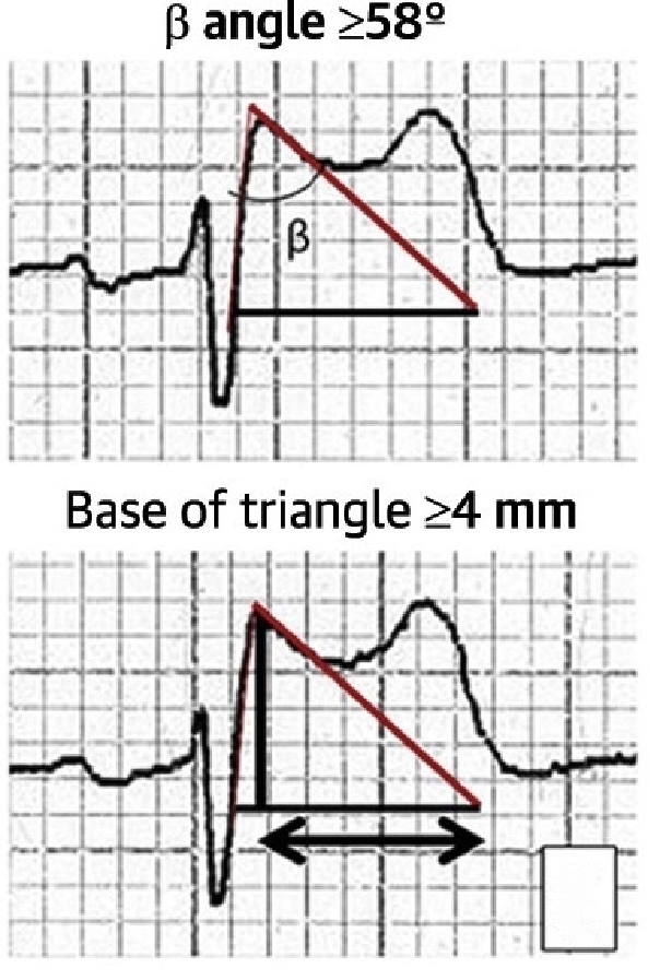 - Угол β: значение ≥58° чаще свидетельствует о высоком риске преобразования данный паттерн в паттерн 1 типа и свидетельствует в пользу синдрома Бругада.