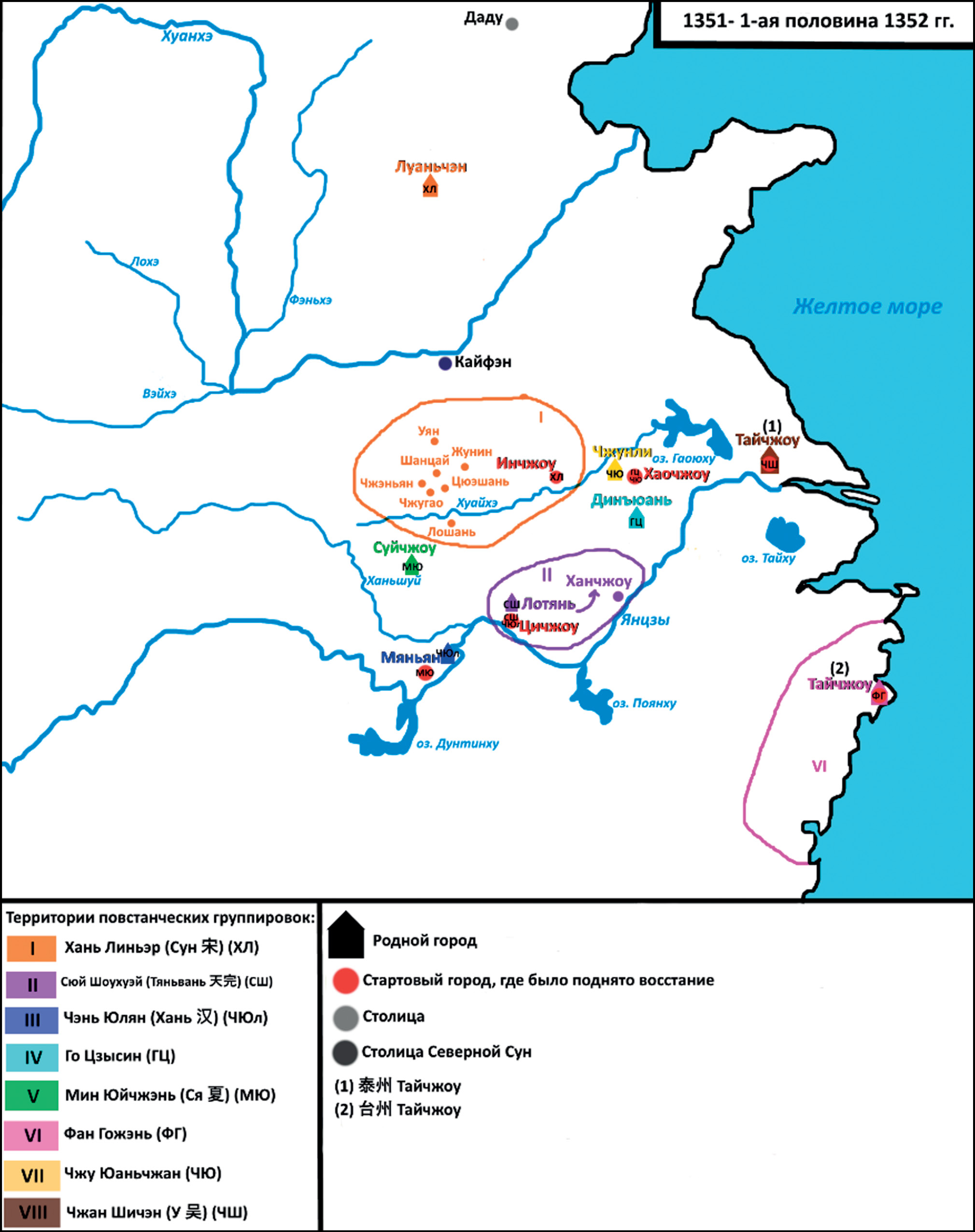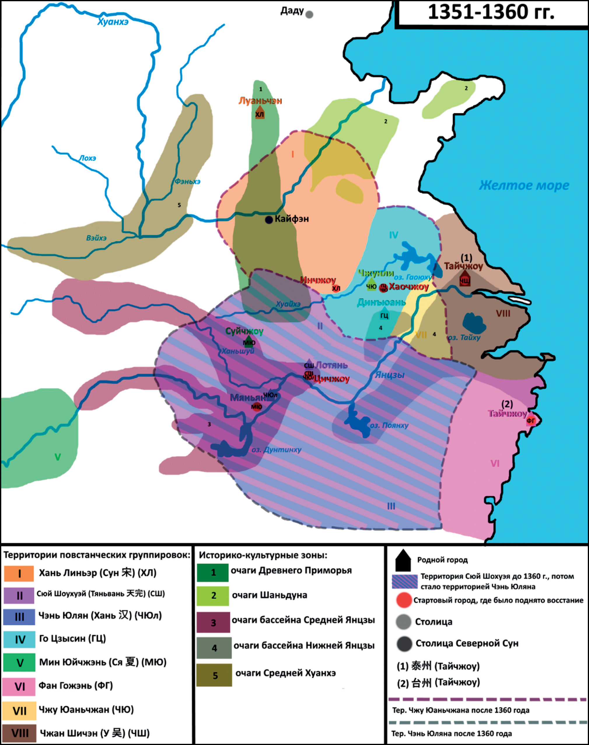 Таким образом, с одной стороны, восставшие имели отношения, построенные на браке, общности районов происхождения и районов влияния. С другой стороны, цели, которые они преследовали, были не социальными и не религиозными, а политическими. Они создавали свои государства в границах тех зон, где начиная с древности существовали прочные традиции государственной самостоятельности. Иначе говоря, изначальные границы районов их действий и их влияния совпадают с границами древних зон зарождения государственности. Поэтому наиболее логично считать их продолжателями именно этих традиций, уже в который раз в китайской истории снова выходивших на историческую арену в условиях ослабления контроля правительства империи Юань над данными районами и последовавшего за этим вакуума власти. Следовательно, для интерпретации характера восстания наиболее логичным будет использование концепции историко-культурных зон Восточной Азии как районов преимущественного зарождения процессов этно- и политогенеза12.