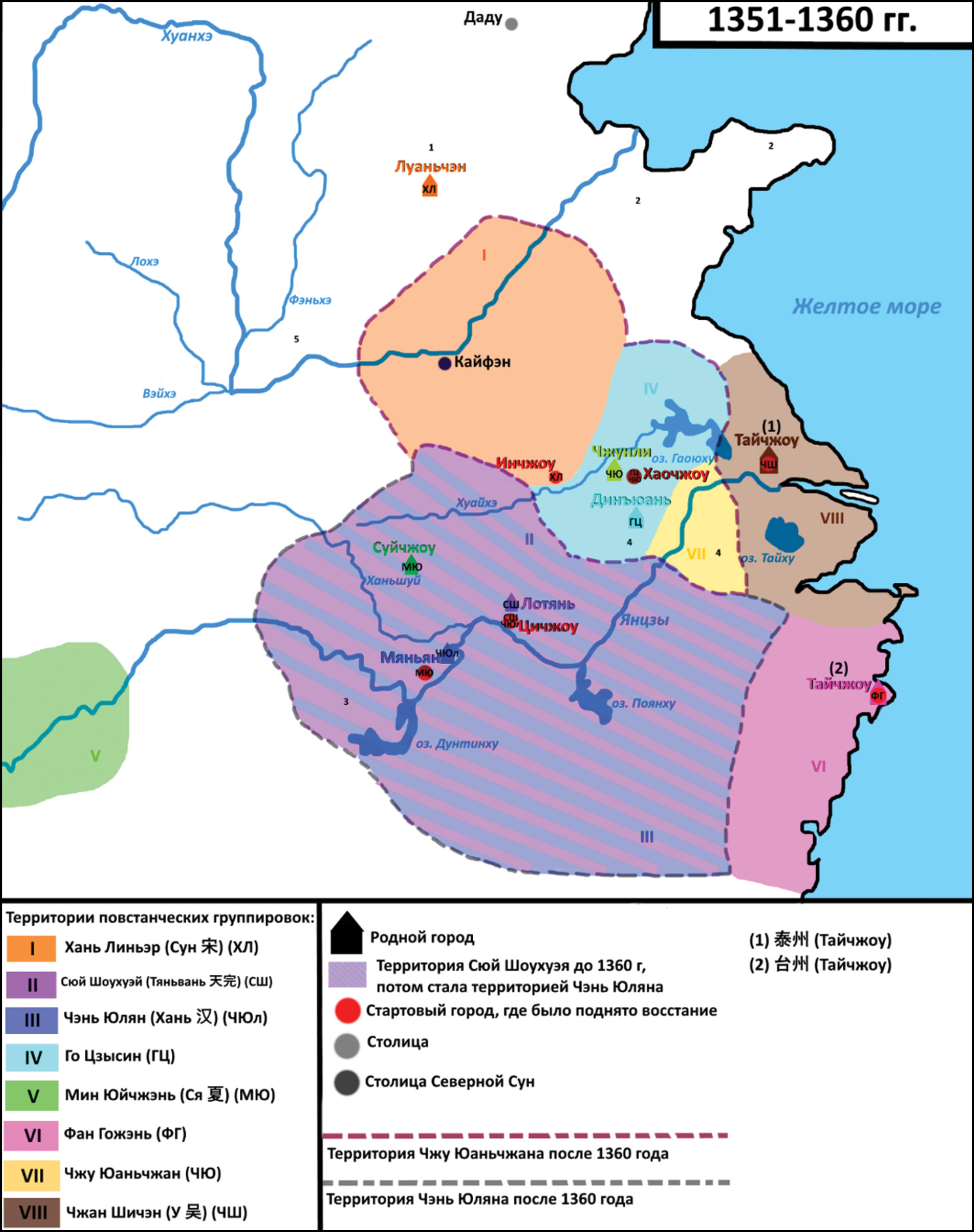 - Хань Линьэр, который имел прямые связи с сектой «Белого Лотоса», в процессе восстания выходил за пределы своей историко-культурной зоны, а также в 1355 г. образовал государство Сун.
