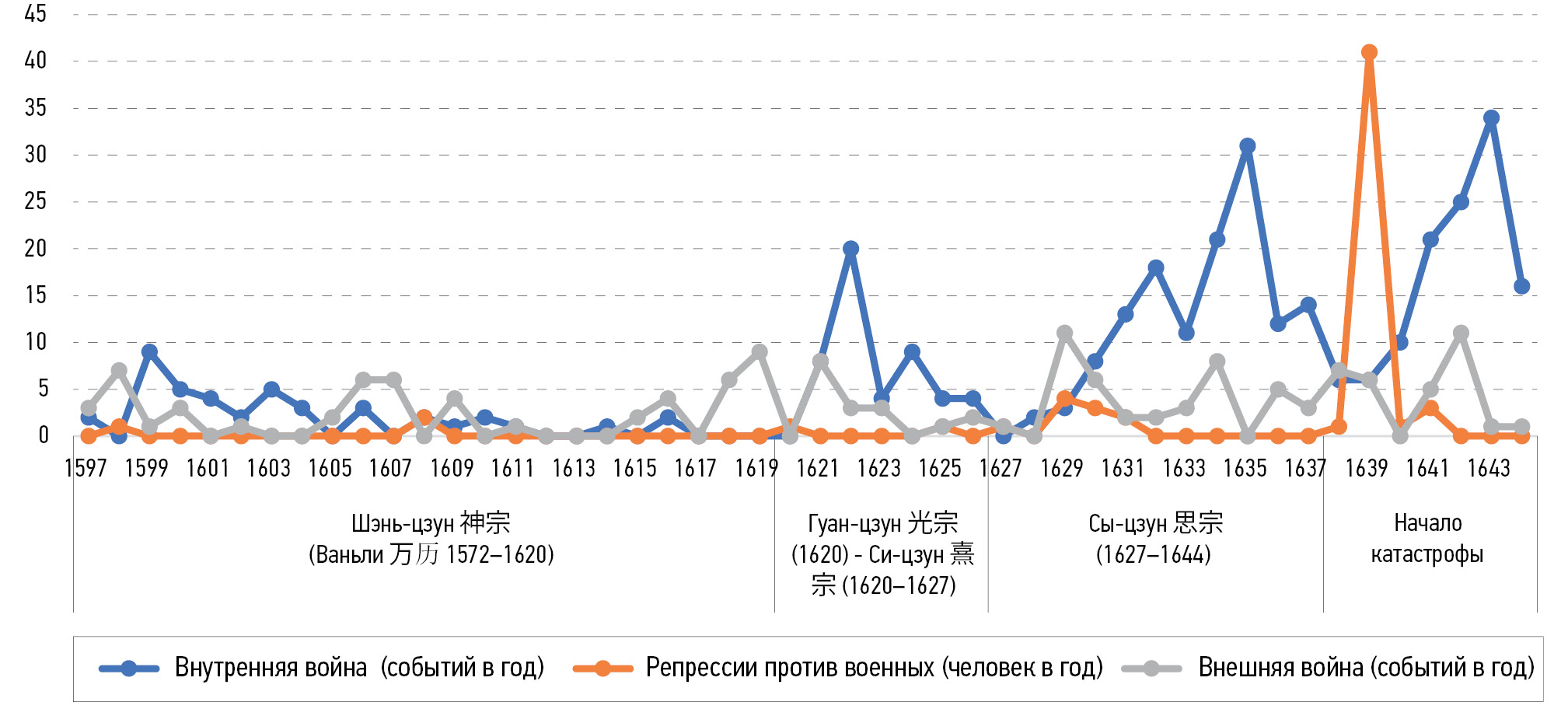 Отметим, что на протяжении всего рассматриваемого периода, с 1597 по 1644 г., в империи происходили периодические бунты и восстания, однако благодаря карательным походам, во главе которых прежде стояли опытные генералы, все народные волнения своевременно пресекались, не перерастая в массовое явление. Это хорошо видно на графике, отмечающем упоминания в источнике событий, относящихся к внешним и внутренним войнам (рис. 1). Параллельно этот график показывает, сколько военных было репрессировано за год (аресты и казни).