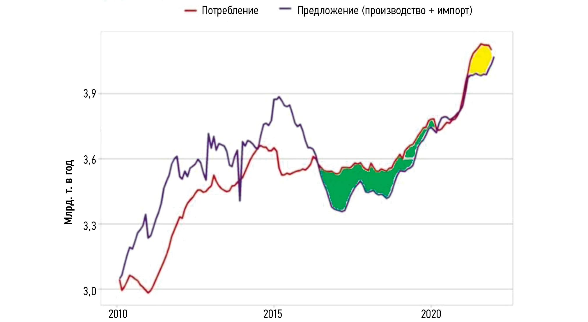 Рис. 1. Потребление и предложение угля в КНР (скользящая сумма за 12 месяцев) [2].