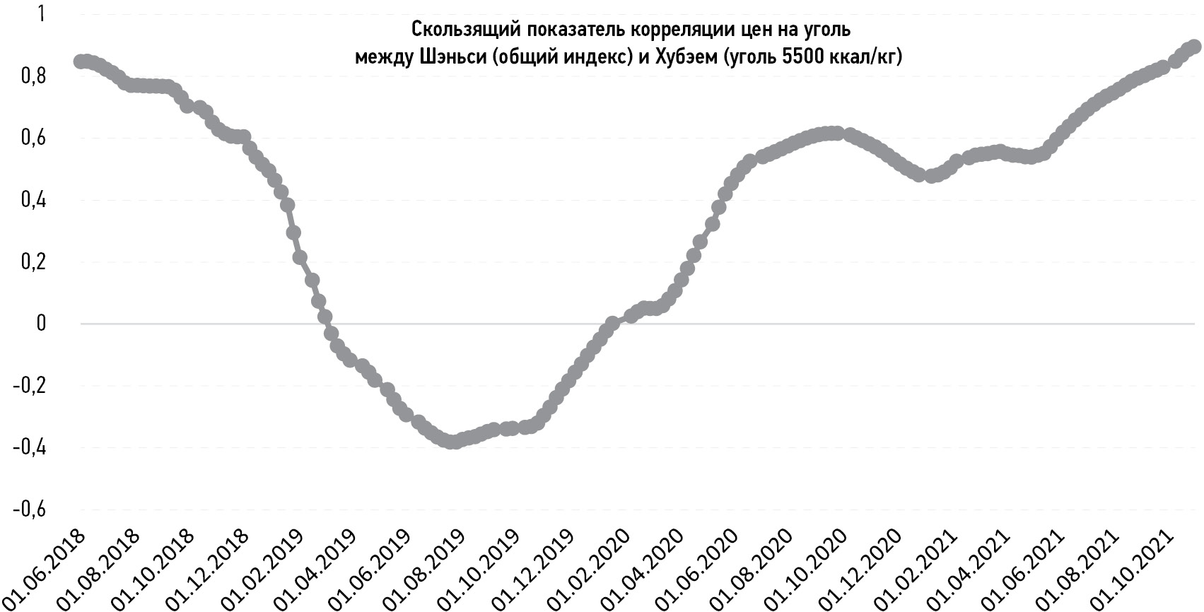 По нему четко видно, что корреляция между ценами на уголь в двух провинциях была положительной с 1 июня 2018 г. по 1 марта 2019 г., отрицательной — с 8 марта 2019 г. до 10 января 2020 г., а после этого была положительной. С конца января 2021 года (пятый период динамики цен в Шэньси) она превысила показатель в 0,5, а с конца мая 2021 года стремительно росла до показателя в 0,9 за октябрь 2021 года. Такие показатели грубо и приблизительно отражают некоторые объективные факты: