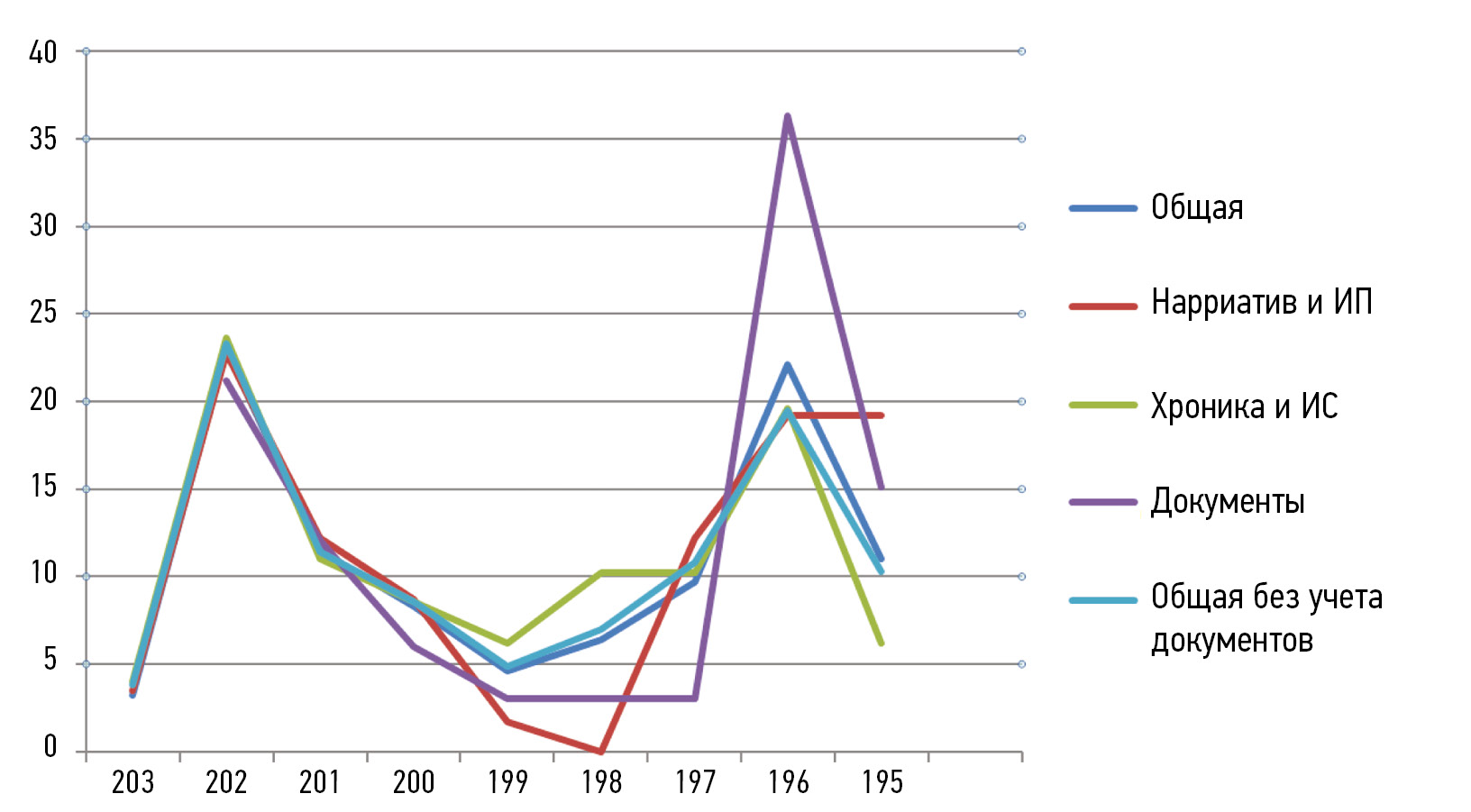 Важнейшим моментом с точки зрения структурной значимости документов в тексте второй части первой главы Хань шу является то, что документы, как структурная группа, инструментом историографического влияния не являются. Динамика распределения документов не приводит к изменению приоритетов распределения исторической информации вообще (рис. 2, линия «общая без учета документов»), из чего можно предположить, что присутствие документов в тексте главы не являлось инструментом историографической манипуляции, а в той или иной степени отражало реальность с точки зрения высшей бюрократической активности в тот или иной момент периода 202–195 гг. до н.э.