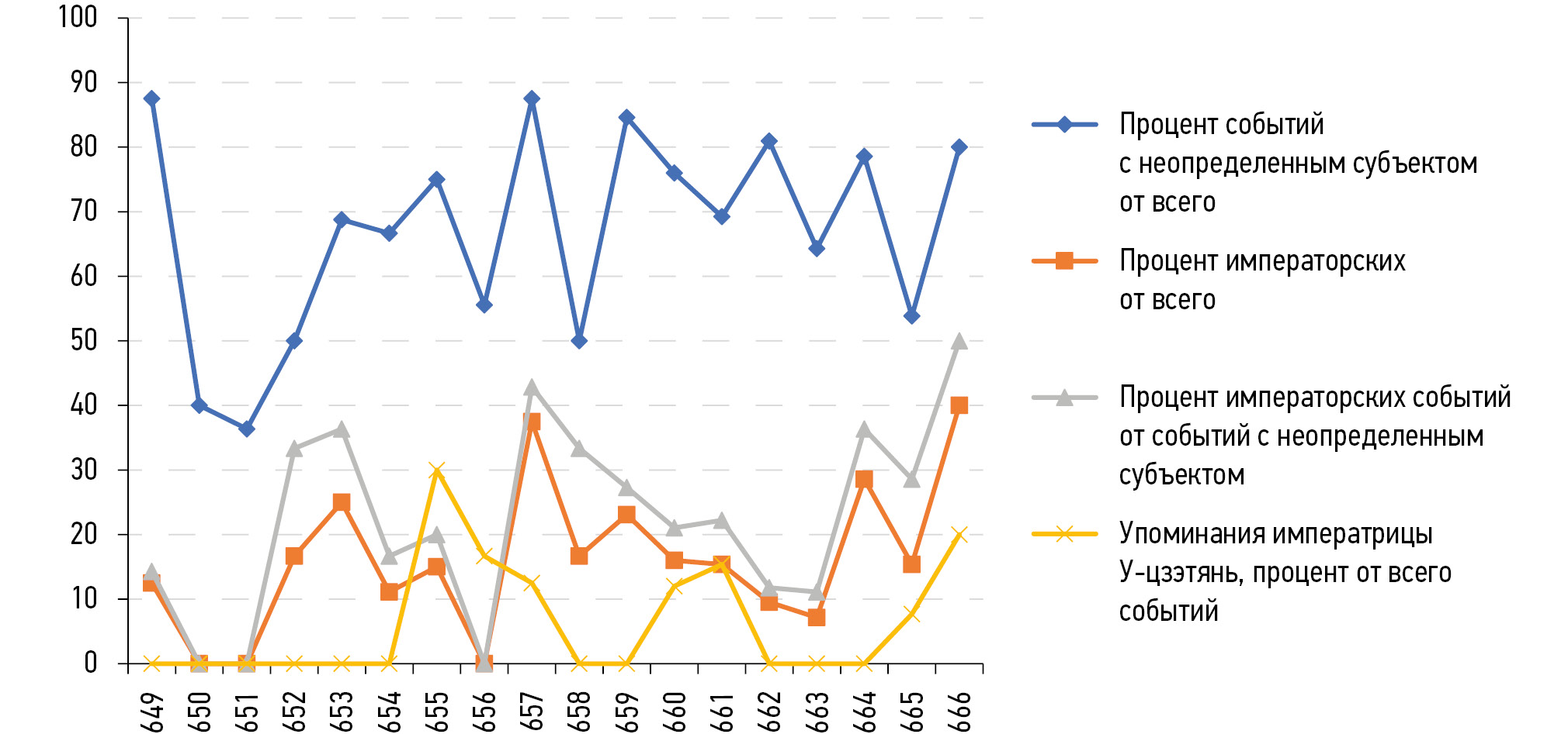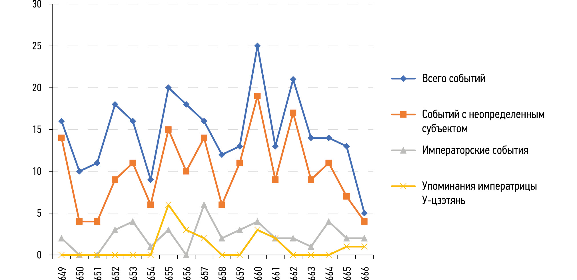 Для того чтобы получить представление о динамике политического процесса, мы подсчитали все события, упомянутые в 4-м цзюане Цзю тан шу, и классифицировали их по субъектам действия, упомянутым в сообщениях памятника25. Этими субъектами стали император Гао-цзун, императрица У Цзэтянь, «неопределенный субъект» (где субъект прямо не обозначен и на русский язык такие предложения переводятся в неопределенно-личной форме). Результаты этой классификации, в хронологической последовательности сопоставленные с годами рассмотренных выше четырех девизов правления императора Гао-цзуна, представлены в графиках (рис. 1, 2).