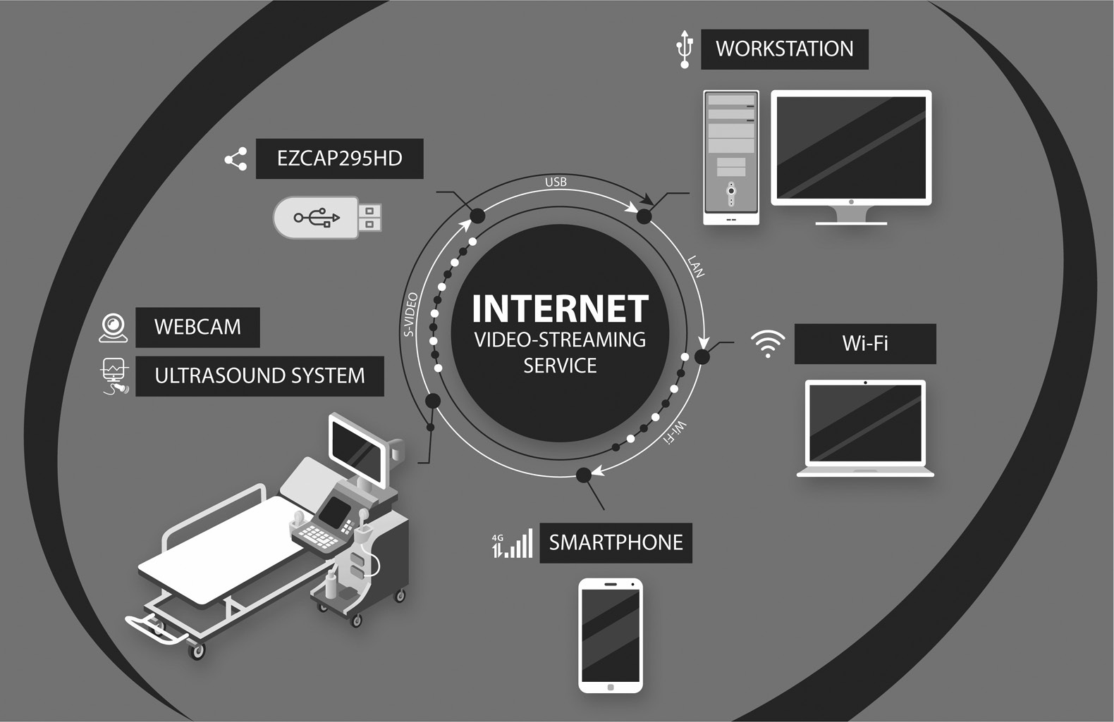 大多数10-20年的超声扫描器都设有视频输出,用于连接外部显示器和/或视频打印机。利用游戏行业的研制成果(用于在游戏过程中捕获音频和视频的特殊设备[6]),以及允许实时直播游戏的软件,陈旧诊断设备的功能可以得到扩展。