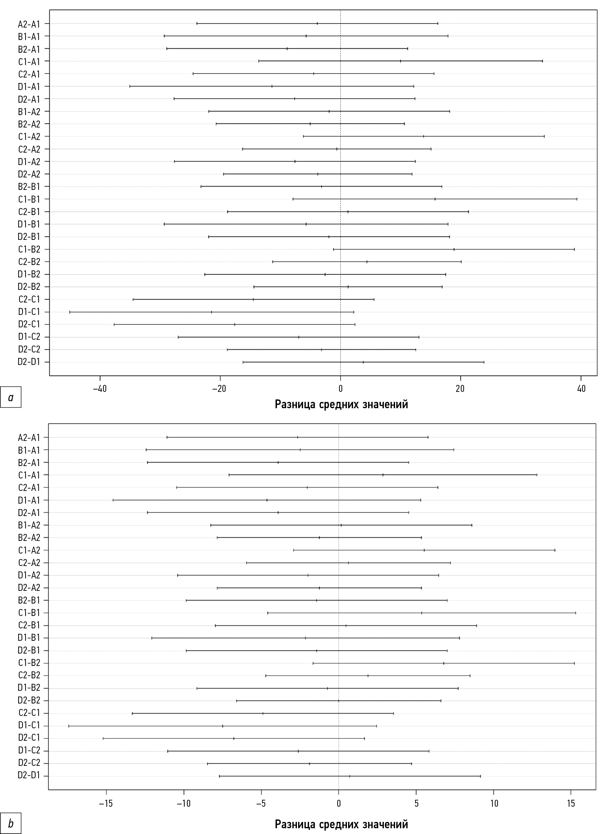 Рис. 2. Постапостериорный анализ гипотезы о сходстве средних: а ― бинарная классификация; b ― нормированная классификация (Протоколы Sharp CT, Soft CT, Sharp LDCT и Soft LDCT закодированы буквами A, B, C и D соответственно, группа нормы закодирована цифрой «1», группа избыточного веса ― цифрой «2»).