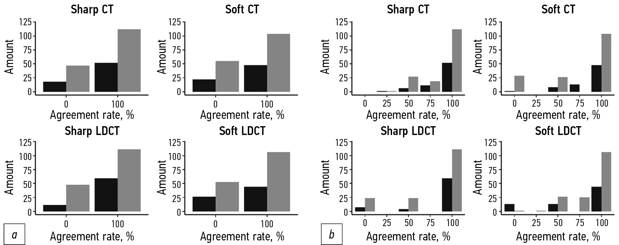 For overweight patients, the highest inter-rater agreement rate was recorded for Sharp CT (71.2% and 88.4% for binary and weighted classifications, respectively). The lowest agreement rate for this group of patients was observed when using the Soft CT protocol: 64.4% and 86.4% for binary and weighted classifications, respectively) (Figure 1 and Table 1).