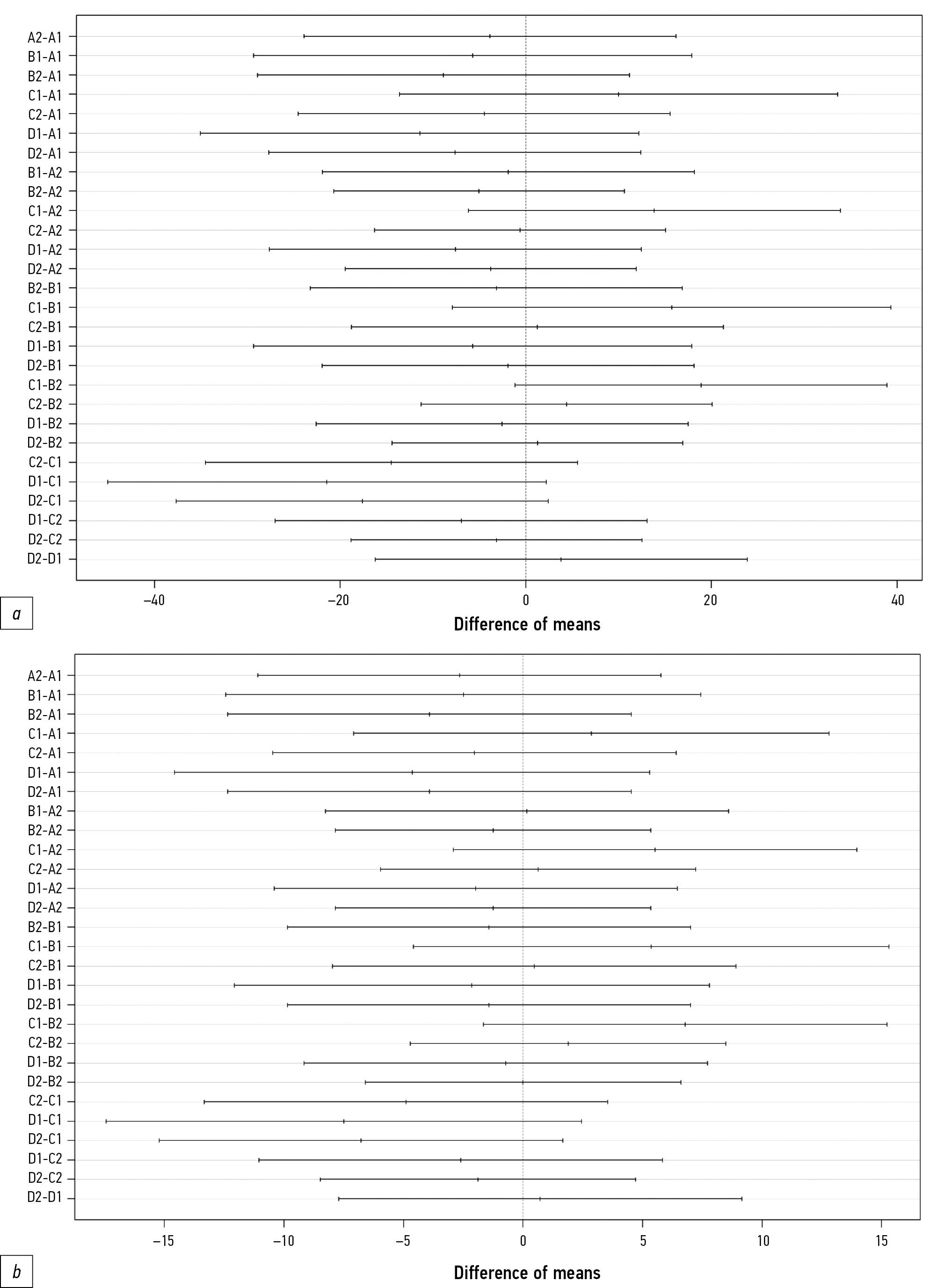 Fig. 2. A post-post-hoc analysis of our hypothesis for the similarity of means: (a) binary classification; (b) normalized classification (Sharp CT, Soft CT, Sharp LDCT, and Soft LDCT protocols are coded with A, B, C, and D, respectively; the normal weight group is coded with “1”; the overweight group is coded with “2”).