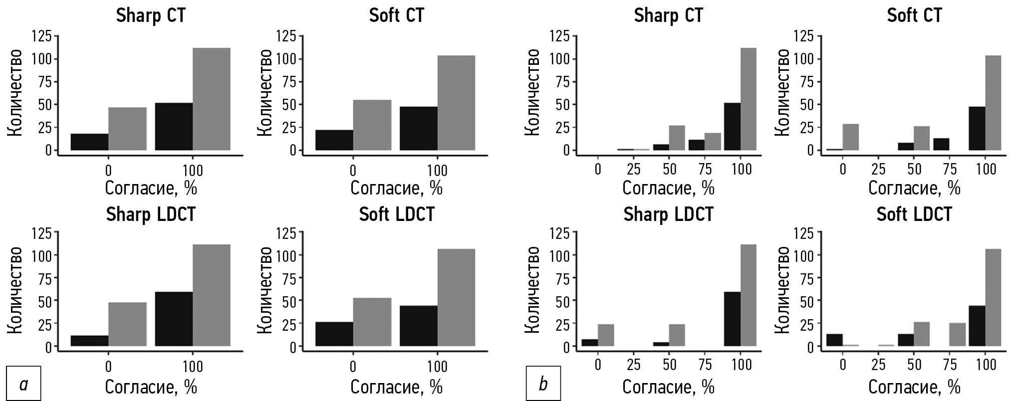 Каждому участнику исследования в рамках одного визита было последовательно выполнено два исследования ОГК по стандартному и низкодозному протоколу. Анализ КТ-исследований проводили 10 врачей-рентгенологов с опытом работы от 3 до ≥25 лет, прошедших обучение интерпретации COVID-19-ассоциированной пневмонии. Для предоставления онлайн-доступа к анонимизированным данным с последующей оценкой степени тяжести заболевания по шкале КТ 0–4 использовали модифицированное программное обеспечение FAnTom [9, 10]. Распределение КТ и НДКТ-исследований, реконструированных в лёгочном и мягкотканном кернелах, проводили среди рентгенологов случайным образом с условием, чтобы каждое исследование независимо и заслеплённо интерпретировали два специалиста.