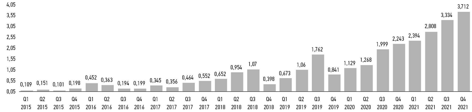 Fig. 1. Dynamics of venture investment in artificial intelligence systems for medicine and healthcare, according to CB Insights, billion US dollars.