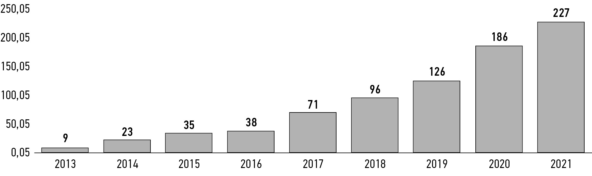 Since 2017, there has been an increase in investment in AI for healthcare (Fig. 1). According to CB Insights2, in 2021, the volume of total investments in companies offering various products based on AI technologies amounted to $12.2 billion (505 transactions). For comparison, this figure was $6.627 billion in 2020 (397 transactions), $4.129 billion in 2019 (367 transactions), and “only” $2.7 billion in 2018 (264 transactions)3.