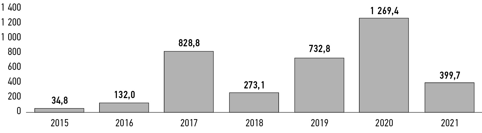Fig. 3. Dynamics of Russian investments in artificial intelligence systems for medicine and healthcare in 2015–2021 (authors' data), million rubles