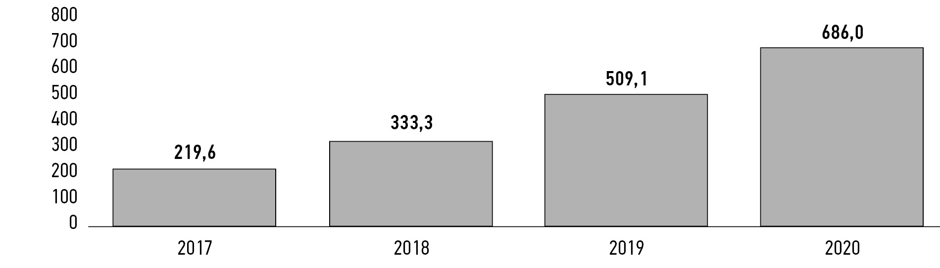 Fig. 6. Revenue dynamics of Russian developers of artificial intelligence systems for medicine and healthcare in 2017–2020 (authors' data), million rubles