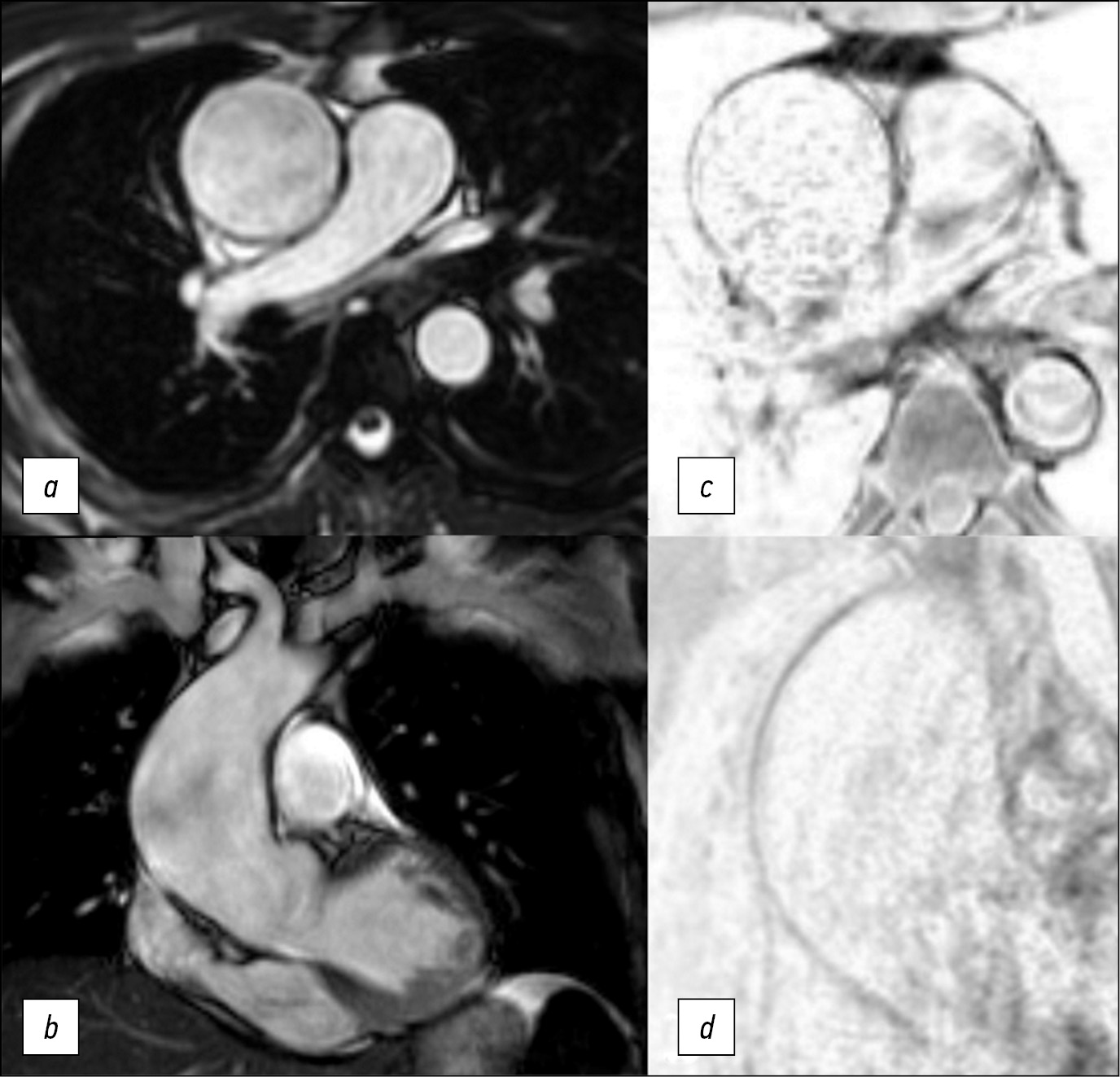 Fig. 1. Images obtained in the SSFP mode in the axial (a) and coronal (b) planes, T1-SE (middle third of the aortic aneurysm) in the axial plane (c), T1-SPIR in the "black blood" mode in the oblique plane (d ). Thinned wall of the aorta, more pronounced in the middle part.