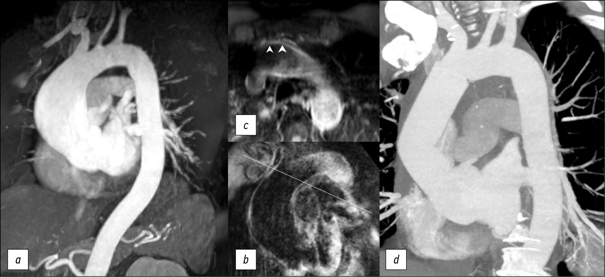 Fig. 2. MR-contrast enhancement angiography, arterial phase, in breath-hold, in the oblique plane, 3D reconstruction of the aorta (a), T1-SPIR-BB imaging, axial plane (b) immediately after distal aneurysm edge of ascending aorta; oblique plane (c) before orifice of the brachiocephalic trunk. The intact thickness of the aortic wall (arrows), CT angiography of the thoracic aorta after surgical treatment (d).