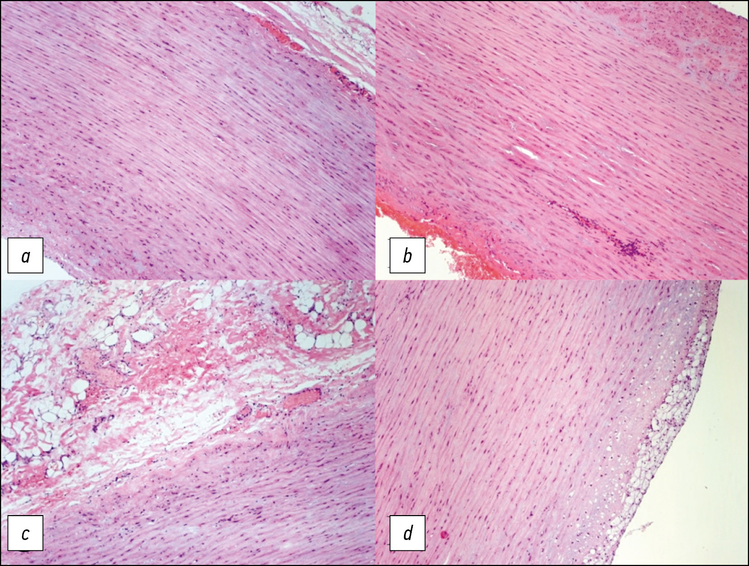 Fig. 3. Proximal (a, b) and middle (c) parts of the body of the aneurysm. Disseminated perivascular lymphoid infiltrate. Distal part of the resected aortic wall (d). All images show a picture of destruction, mucoid edema of elastic fibers, smoothing of elastic membrane folds.
