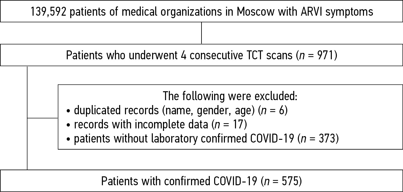 Records of 139,592 patients of medical organizations in Moscow for the period from March 1 to August 1, 2020 were assessed for compliance with the criteria for inclusion in the study. After exclusion of 139,017 participants for various reasons, for statistical analysis, data from 575 patients with confirmed COVID-19 was used, each of whom underwent four consecutive TCT (thoracic computed tomography) scans (Fig. 1).