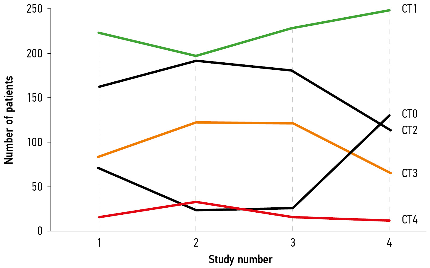 The dynamics of the distribution of disease cases in the sample according to the degree of severity followed a clear pattern. In the interval between TCT studies 1 and 2, the number of patients in categories CT0 and CT1 decreased with an increase in the number of patients of categories CT2, CT3, and CT4. In the interval between studies 2 and 3, the number of patients in categories CT0, CT3, and CT4 stabilized, and relative stability in the number of patients with mild and moderate changes was noted in the presence of an increase in the number of CT1 cases and a decrease in the number of CT2 cases. Finally, at stage 3, the tendencies of stage 1 were reversed, as there was a significant increase in the number of patients in the categories CT0 and CT1, with an equally noticeable decrease in the number of patients in the categories CT2, CT3, and CT4 (Fig. 2).