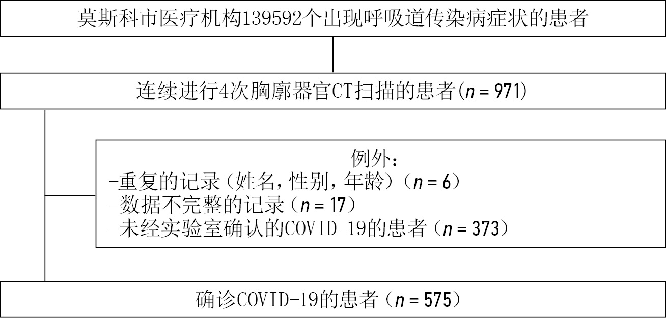对莫斯科医疗机构从2020年3月1日至8月1日期间139592名患者的记录进行了评估,以确定其是否符合纳入研究的标准。排除各种原因后,139017名参与者使用575例确诊COVID-19患者的数据进行统计分析,每个患者均进行了连续4次胸部CT检查(图1)。