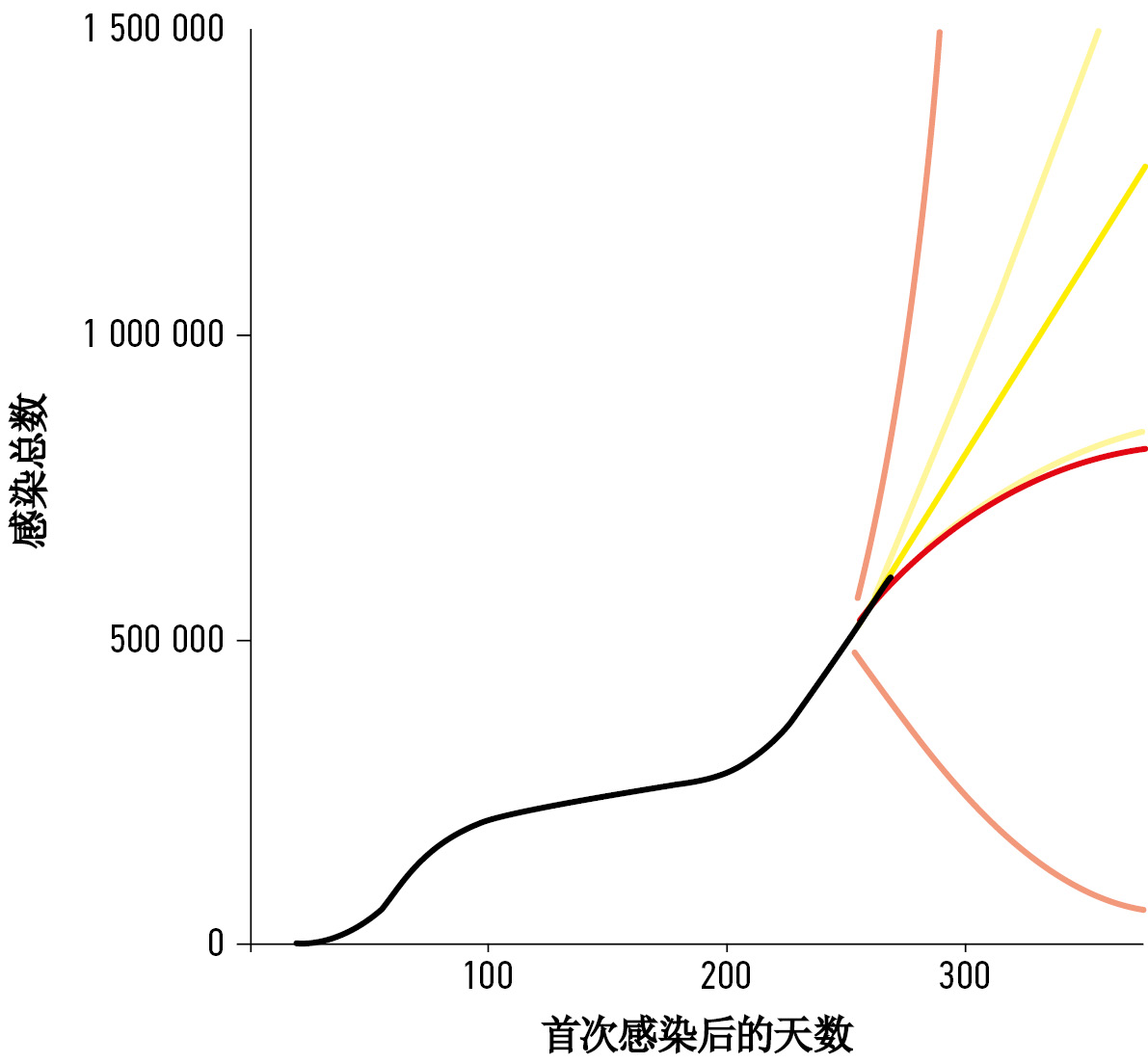 图 3预测COVID-19在莫斯科的流行情况:实际数据(黑色曲线);ETS MMM模型(黄色曲线);ARIMA模型(0,2,1)(红 色曲线)。ETS ZZZ模型的预测没有显示出来,因为它们与ARIMA(0,2,1)重合。对于每个模型,95%的置信区间以相应 的哑色显示。
