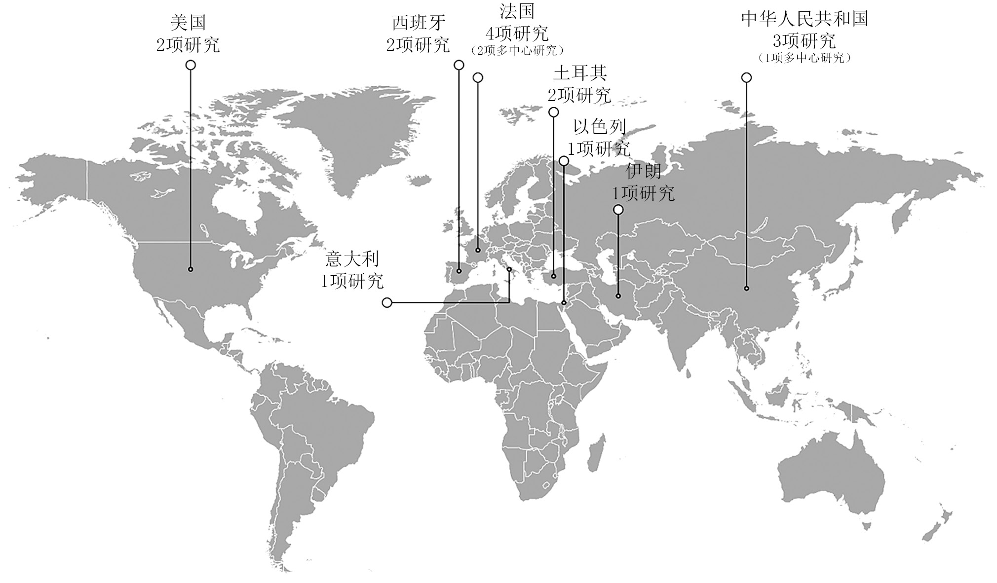 图 2被纳入研究的研究的地理位置。 注:世界地图的图像是在Shutterstock资源上购买的,之后进行更改[35]。