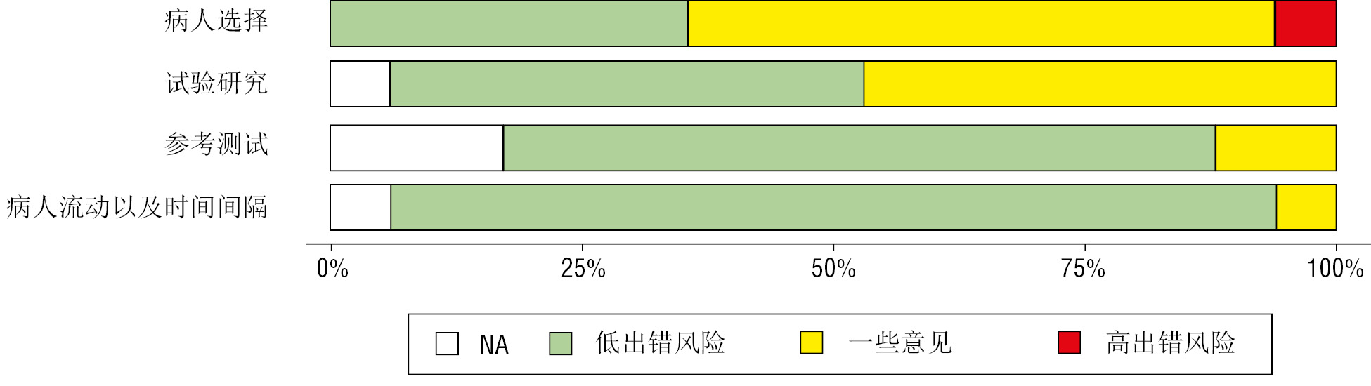 研究中出现系统错误的风险。为了评估与诊断准确性研究相关的方法论困难,作者使用了美国卫生保健研究和质量机构(Agency for Healthcare Research and Quality, Cochrane Collaboration)推荐的系统评审的QUADAS-2(Quality Assessment of Diagnostic Accuracy Studies)检查表[15]。每一篇被选中的论文都在四个方面进行了评估:患者选择、研究测试、参考测试和患者流量。《Cochrane干预措施系统评价手册》(Cochrane Handbook)提供了每个方向的完整描述和使用的判断标准[16]。