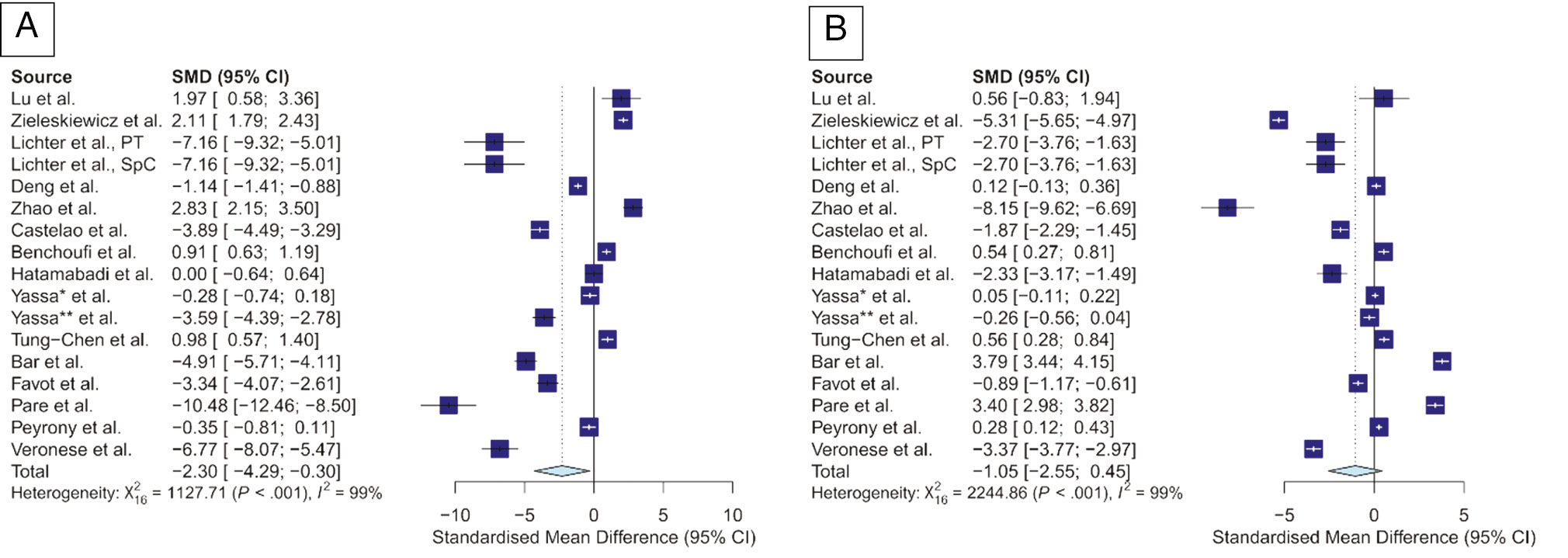 图 4按特异性(A)和敏感性(B)分组数据的森林图*和**符号表示M. Yassa等人的研究,分别致力于不同专家结论的一致性[25]和超声在COVID-19筛查中的诊断意义[26]。SMD—标准均数差;CI—置信区间。