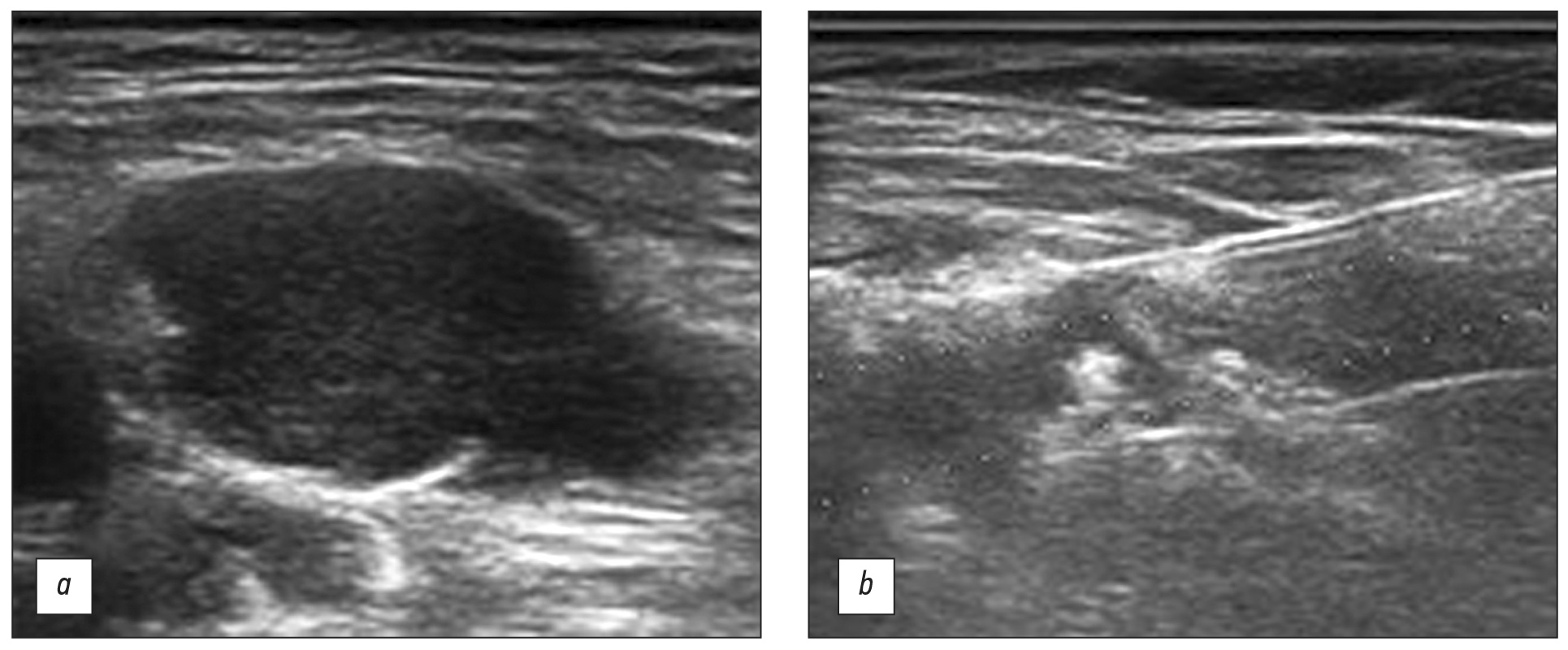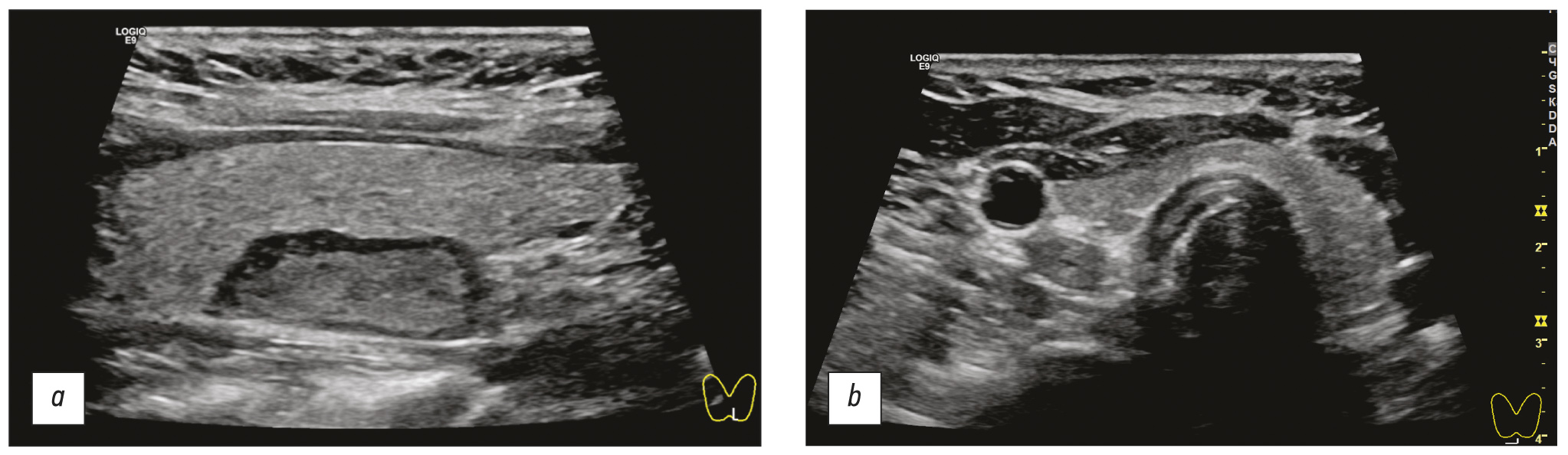 图 2甲状旁腺功能亢进的甲状旁腺功能亢进的超声成像:a - 原发性甲状旁腺功能亢进; b - 继发性甲状旁腺功能亢进。
