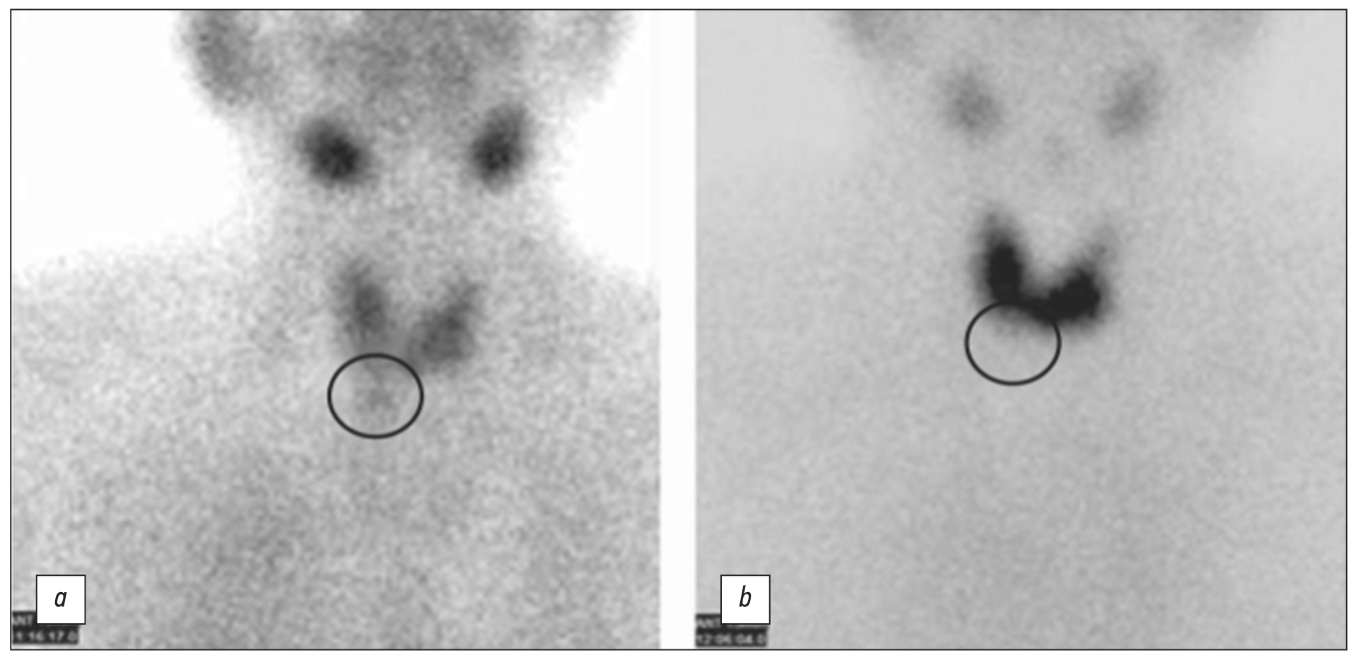据文献报道,在 PGPT 患者中,99mTc-MIBI 研究的敏感性在 88% 的水平[21]。 诊断方法的组合给出了最好的结果。 因此,闪烁显像与 99mTc-MIBI 和超声相结合的灵敏度为 95%,而单独的超声诊断为 80%,放射性核素诊断为 87% [22]。
