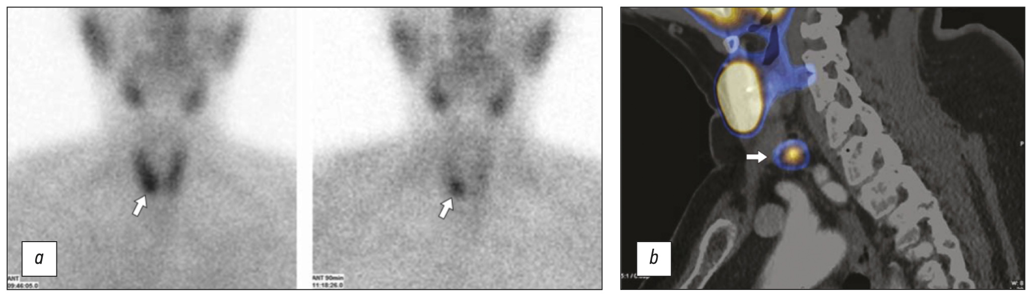 图 4。使用 99mTc-MIBI(technetril)进行放射性核素研究:a - 两相平面闪烁扫描(早期和延迟扫描):甲状旁腺的形成在右叶(箭头)的投影中可视化,放射性药物的持续积累增加关于延迟扫描; b - 单光子发射计算机断层扫描,结合计算机断层扫描,99mTc-MIBI:在左叶下极(箭头)后面和向下形成甲状旁腺,积累放射性药物。